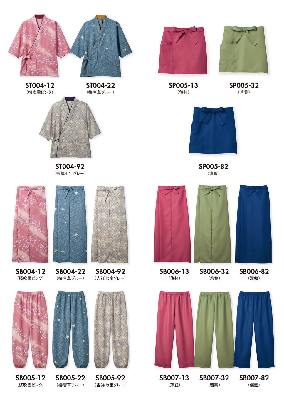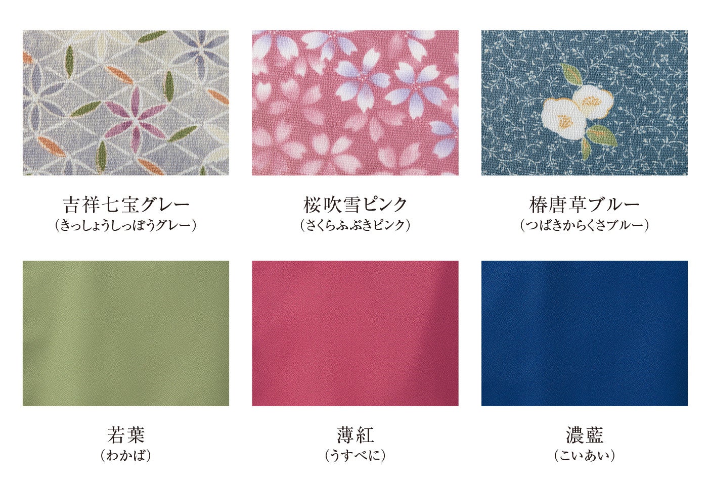 吉祥七宝グレー、桜吹雪ピンク、椿唐草ブルー、薄紅、若葉、濃藍の6色展開。