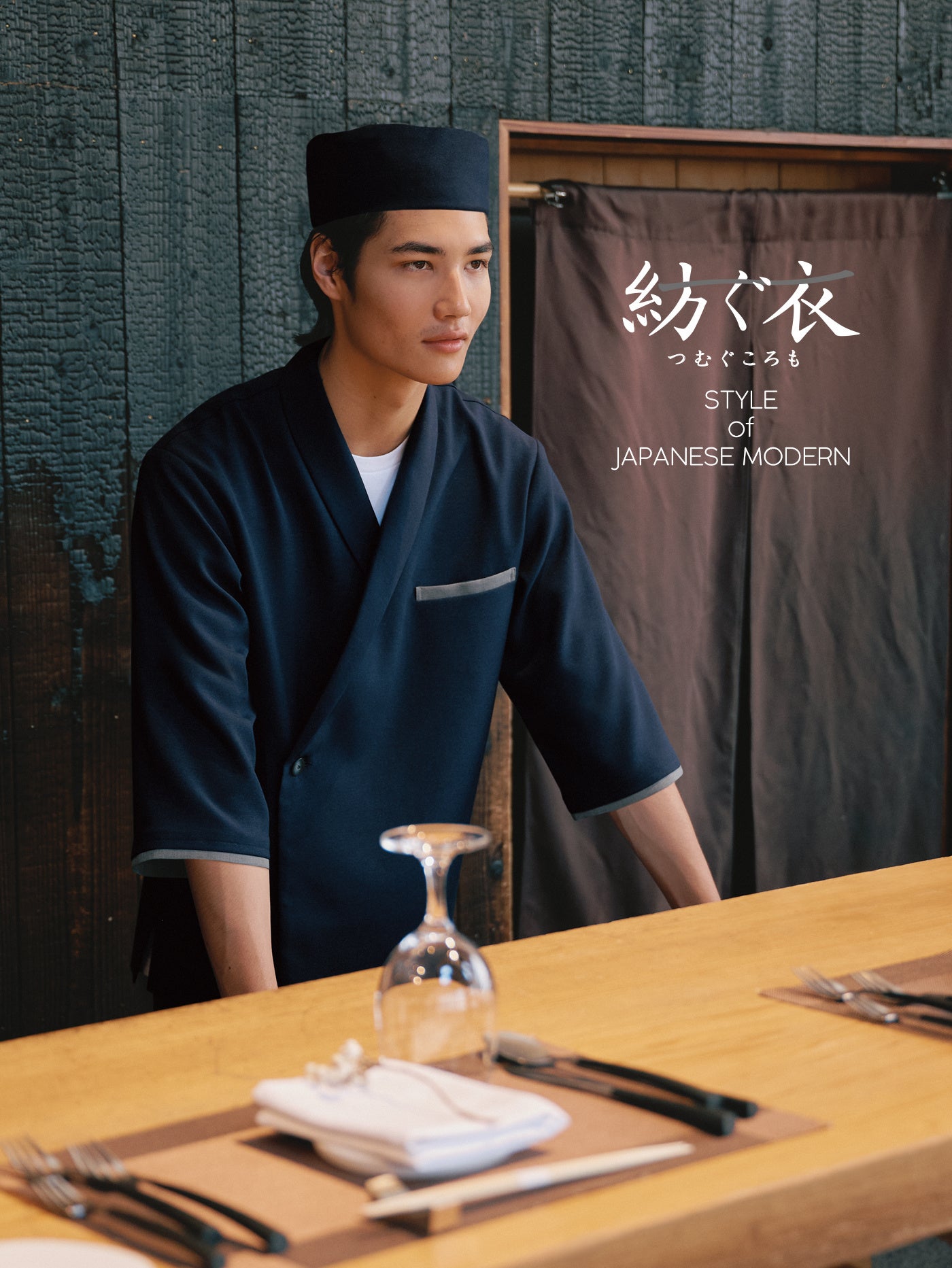 「紡ぐ衣」はジャパニーズモダンスタイルの飲食店の雰囲気に寄り添う落ち着いたシックな色合い。