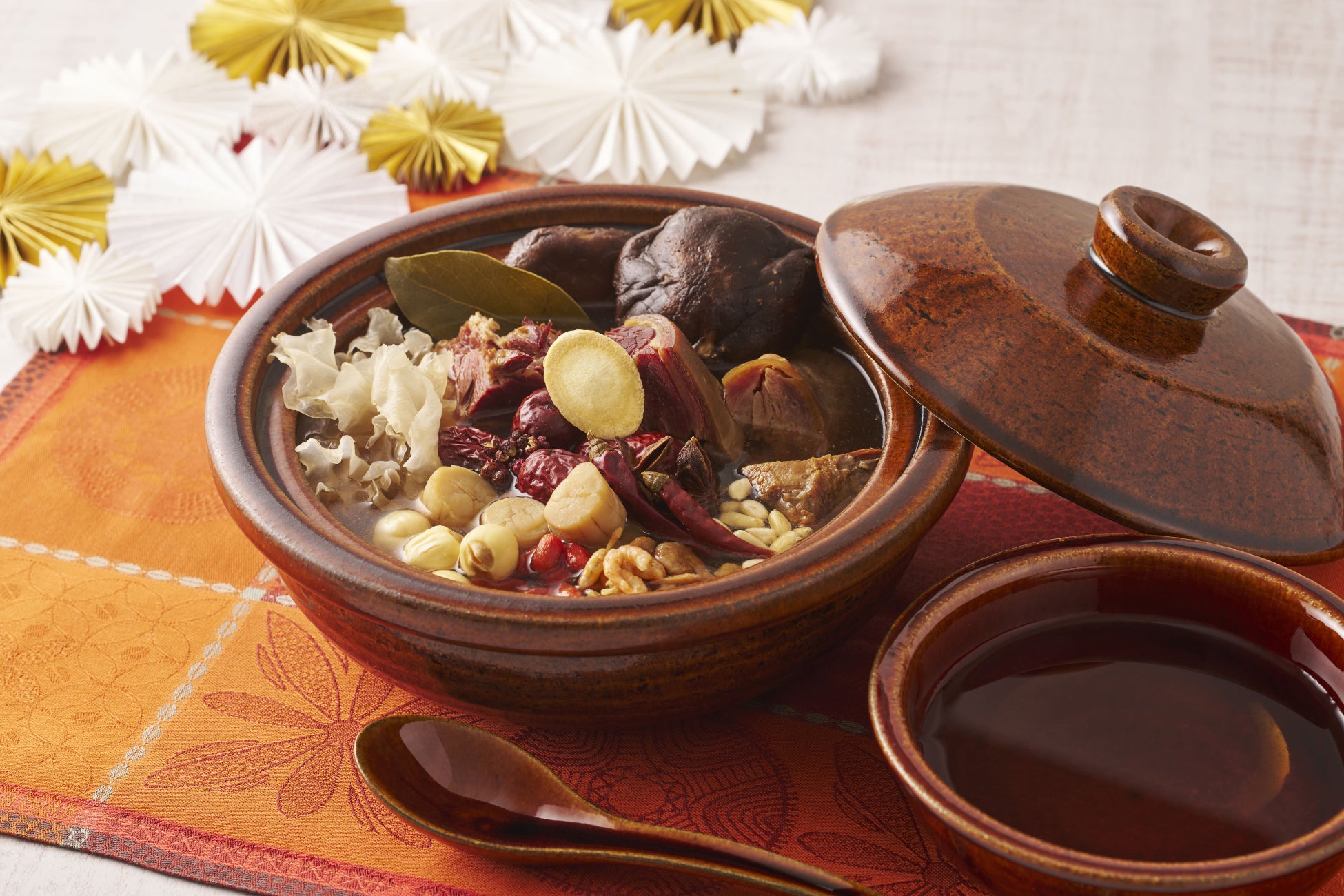金華ハムは、自前で一から再現しようとすると数十種類の香辛料と長い熟成期間を要する希少食材。そこに、干し貝柱・干し海老といった魚介の旨み、さらに高麗人参・当帰など十六種の和漢素材を独自の黄金比で配合。薬膳特有のクセを抑え、“ご馳走として成り立つ薬膳スープ”に仕上げました。創業より培った目利きと技術が息づく安定的に美味しい一皿を、ぜひご家庭でお愉しみください。