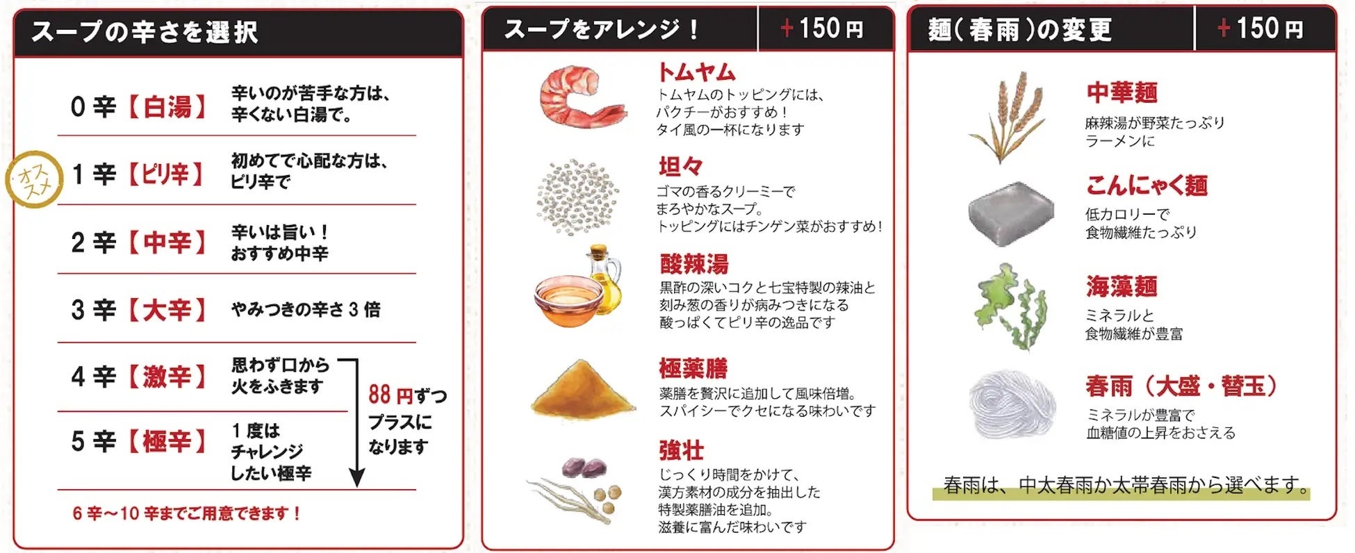 スープの辛さは0から3辛をベースにご用意。お好みで10辛までご用意!