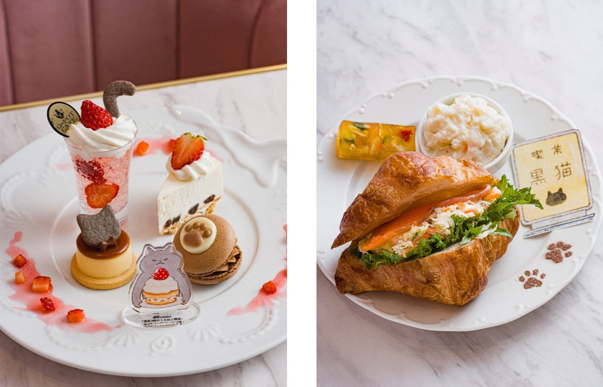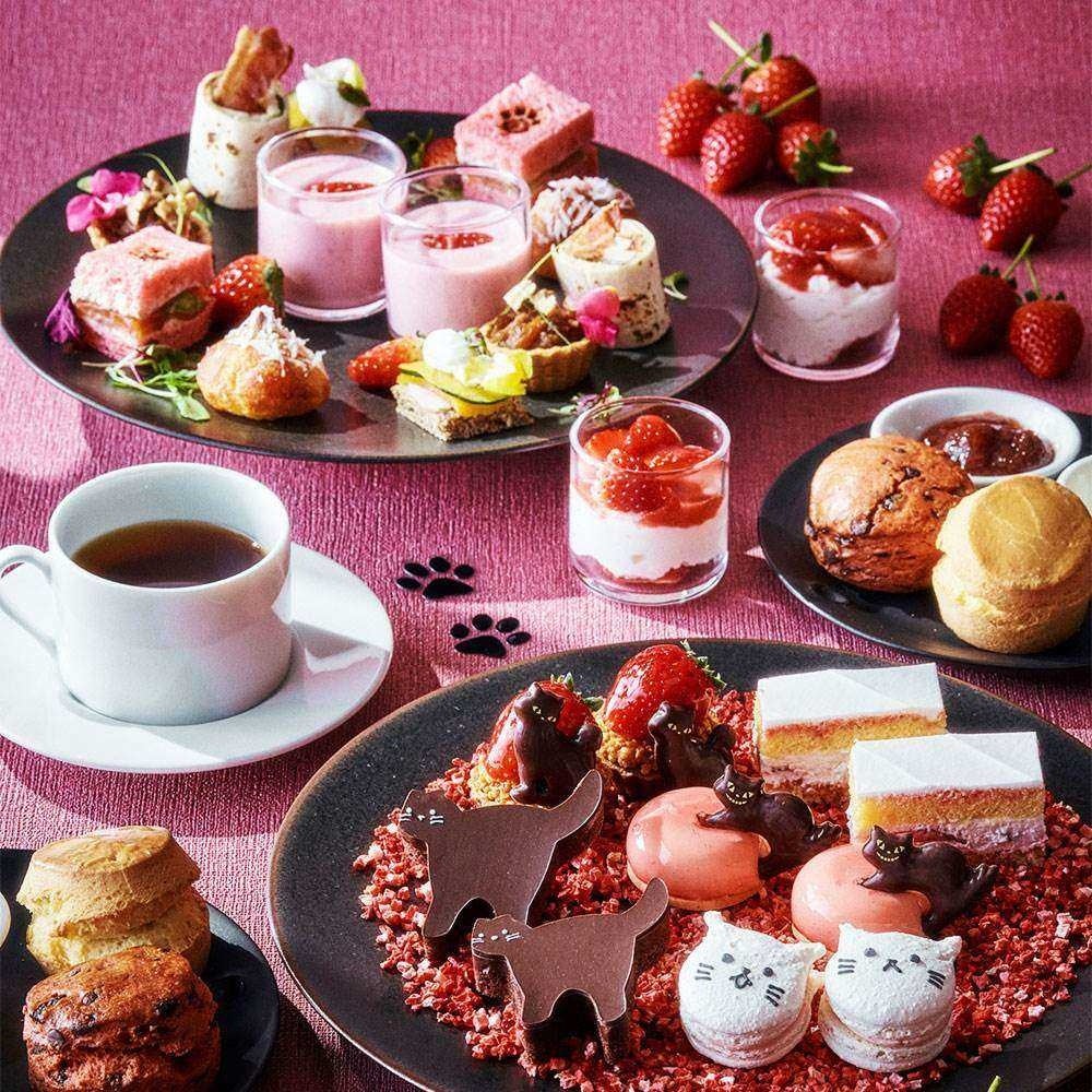 猫の形にくり抜いたチョコレートケーキやいちごガナッシュをサンドした猫のマカロン、そして猫の足跡の焼き印付きサンドイッチなど、旬のいちごの魅力と猫のかわいさを同時に楽しめる品々が勢揃い。