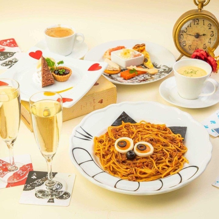 アリスの世界をイメージした本格フレンチイタリアンで、チェシャ猫に見立てたラグーパスタがセットになったランチコース。食後のデザートにはトランプ柄のいちごショートケーキも登場します。
