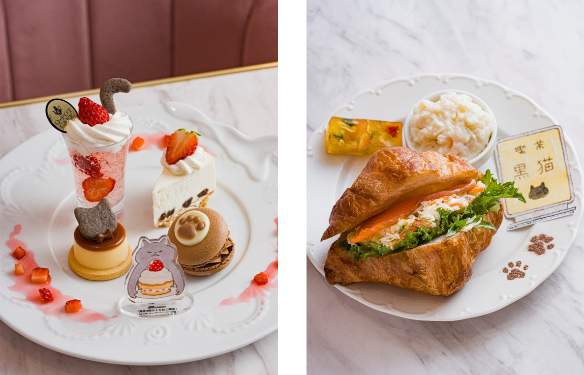 猫の形にくり抜いたチョコレートケーキやいちごガナッシュをサンドした猫のマカロン、そして猫の足跡の焼き印付きサンドイッチなど、旬のいちごの魅力と猫のかわいさを同時に楽しめる品々が勢揃い。