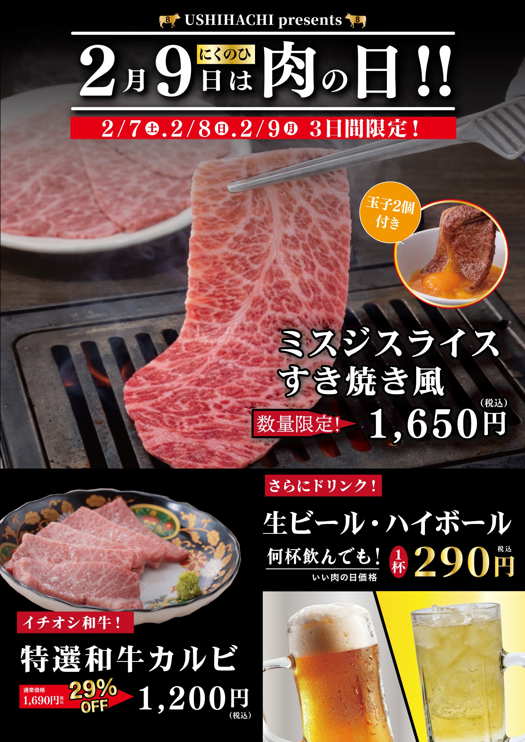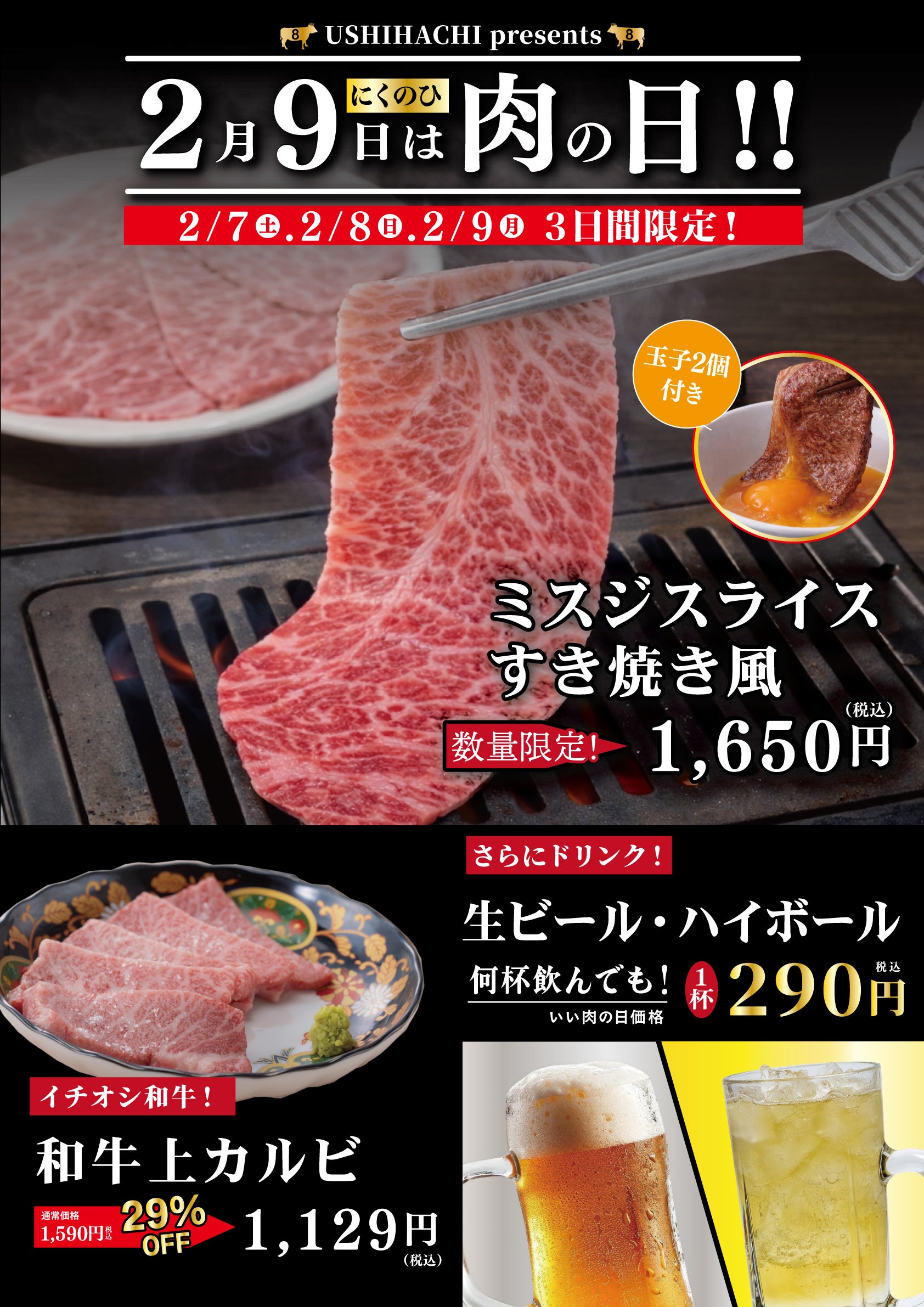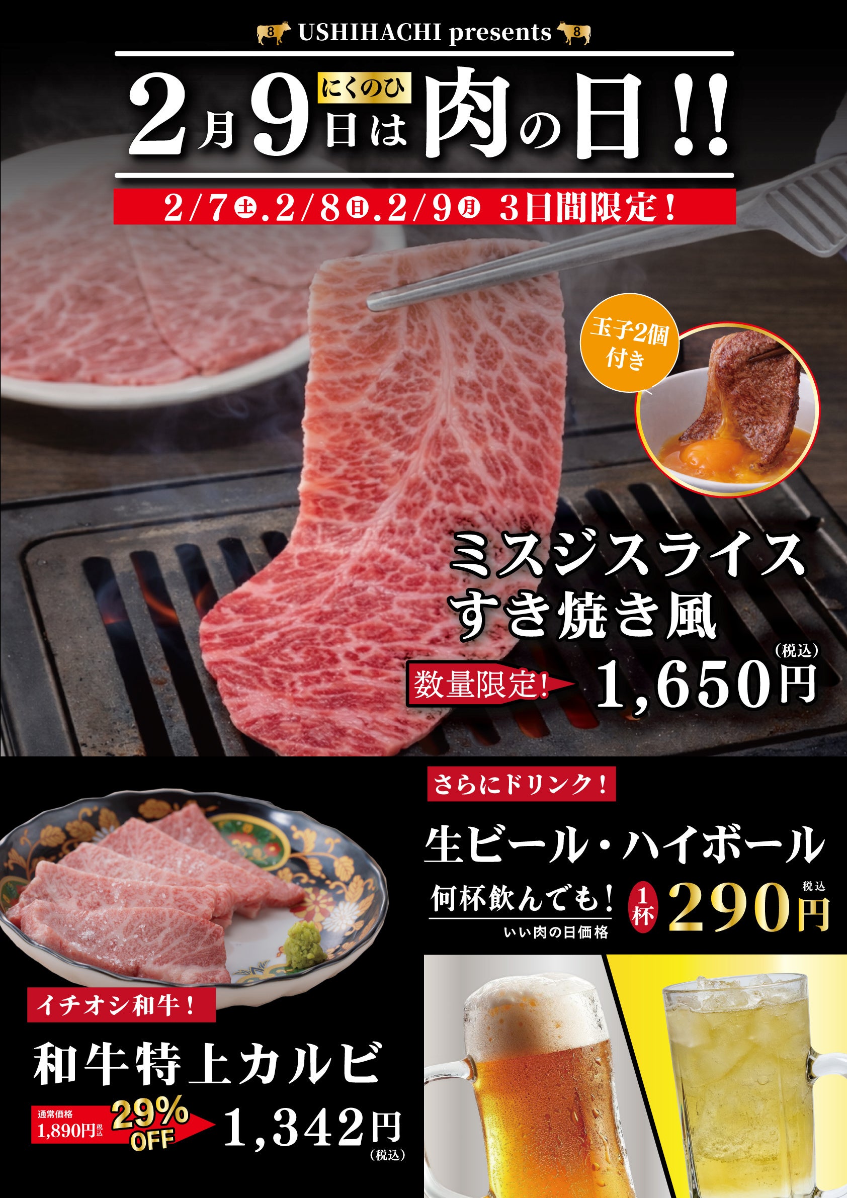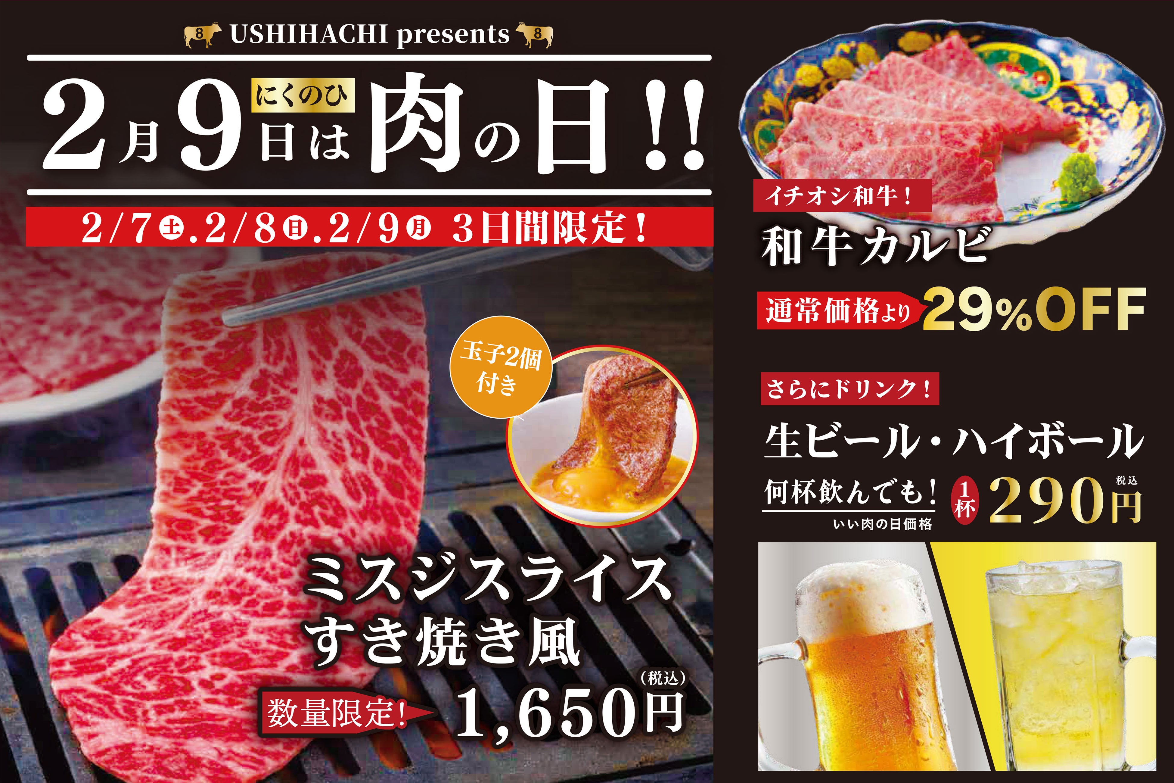 2月9日の”肉の日”にちなみ、限定メニュー「ミスジスライスすき焼き風」を特別価格にてご提供、さらに人気メニュー「和牛カルビ」が29%OFFに!加えて、生ビールとハイボールが何杯飲んでも1杯290円(税込)と破格のお値段でお楽しみいただけます。