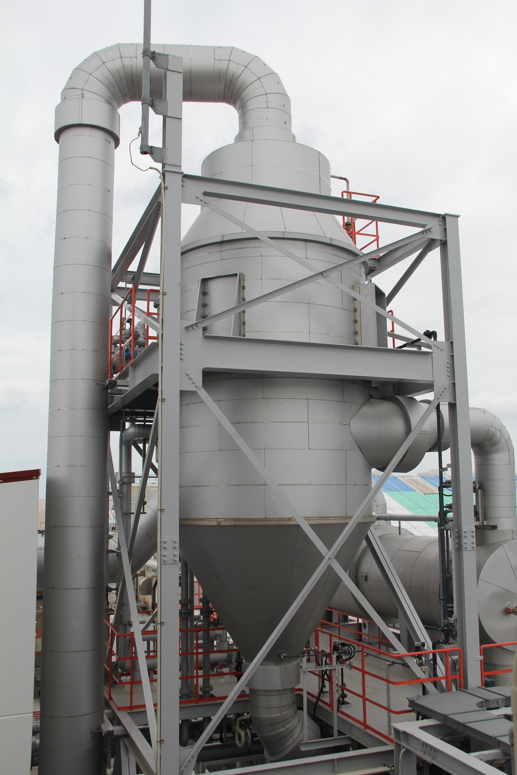 新工場で採用した立釜には、最新のMVR(Mechanical Vapor Recompression:自己蒸気機械圧縮)型蒸発装置を導入しました。MVR型蒸発装置は、製造工程で発生する蒸気の熱を回収し、再び加熱源として循環・再利用する仕組みを持つ省エネルギー技術です。この技術の導入により、エネルギー消費量の低減によるCO₂排出量削減を実現します。