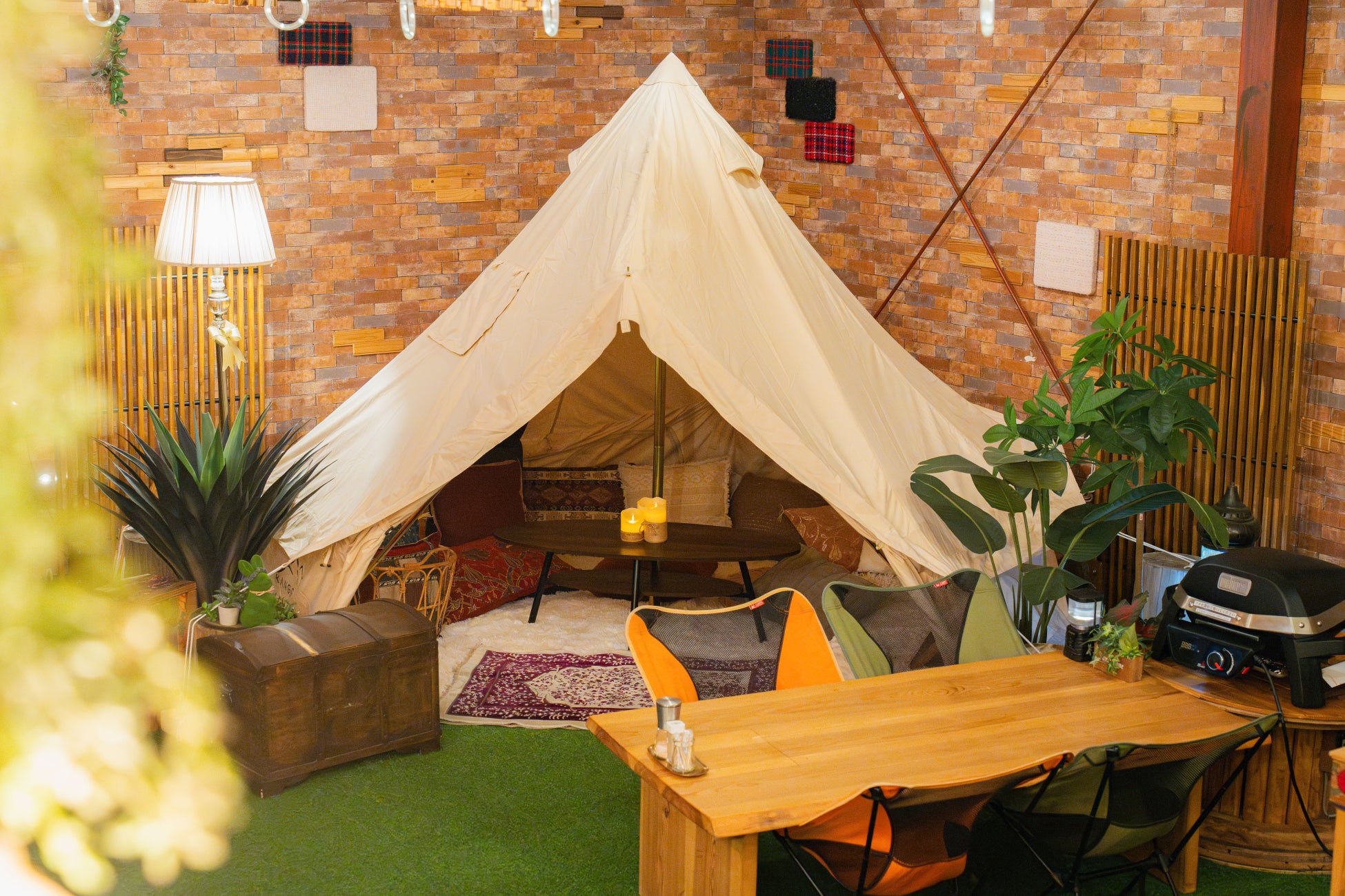 店内には、テント付きローテーブルで“キャンプ感”を楽しめる席があり、テントの中でお食事も可能。写真にも残したくなる“屋内キャンプ”の雰囲気を演出します。