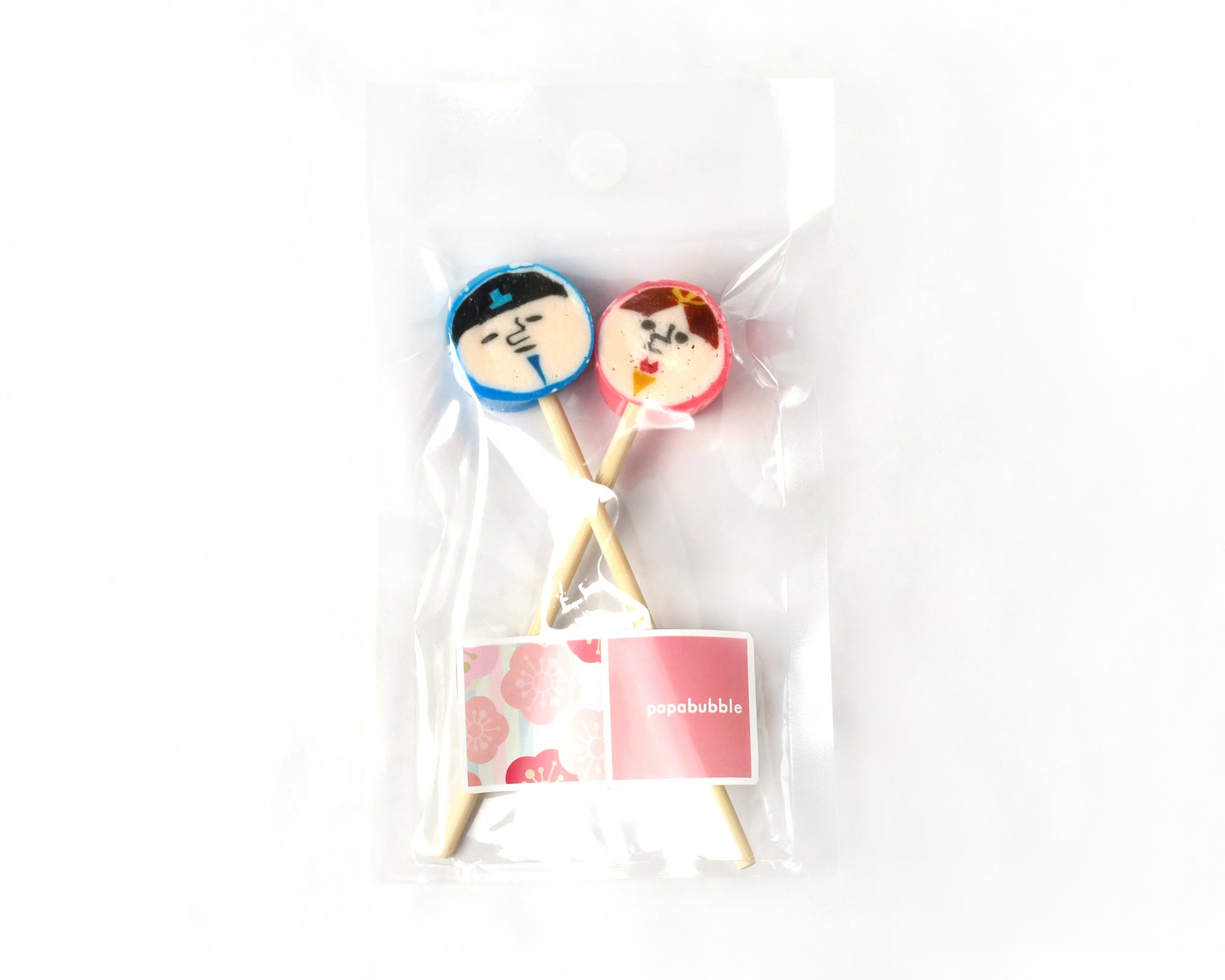 今年のキャンディは、例年とはひと味違う、パパブブレらしい遊び心を加えたデザインが特徴です。ちょっぴりシュールで個性的な表情のお内裏様とお雛様を主役にした、印象的なキャンディに仕上げました。