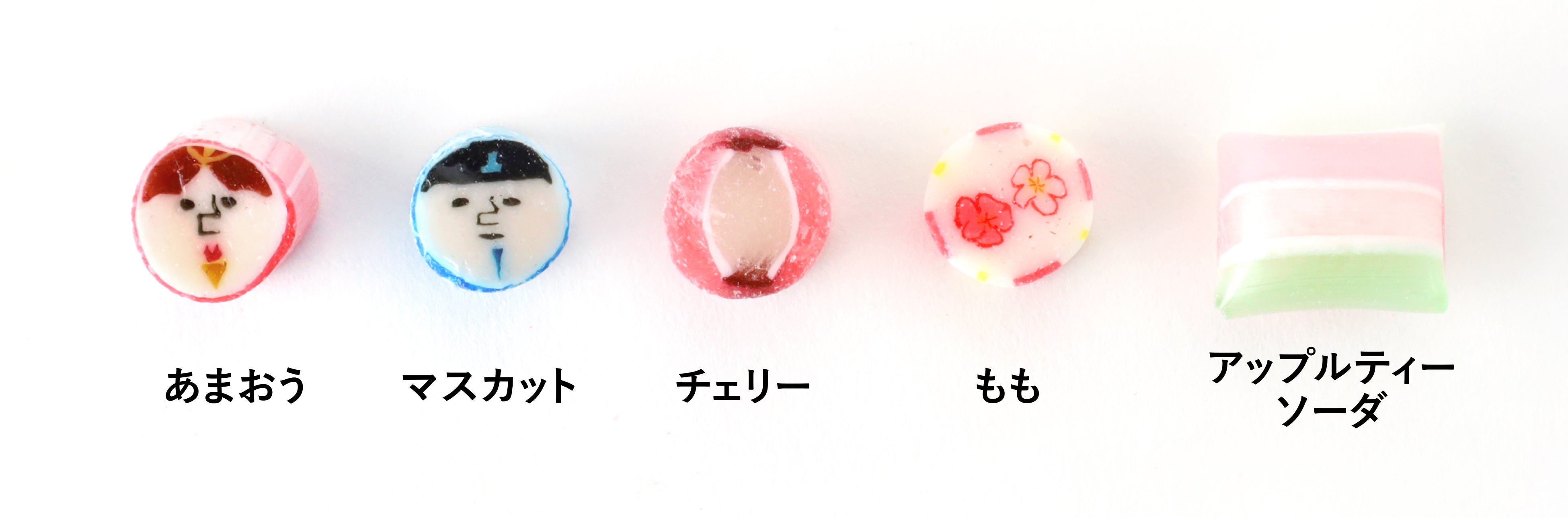 ぼんぼりはキャンディ全体で表現し、明るい場所にかざすと、実際のぼんぼりのようにクリア部分が光る仕様となっています。桃の花は、1粒の中に白とピンクの2種をデザインし、全体の華やかさと可愛らしさを引き立てています。