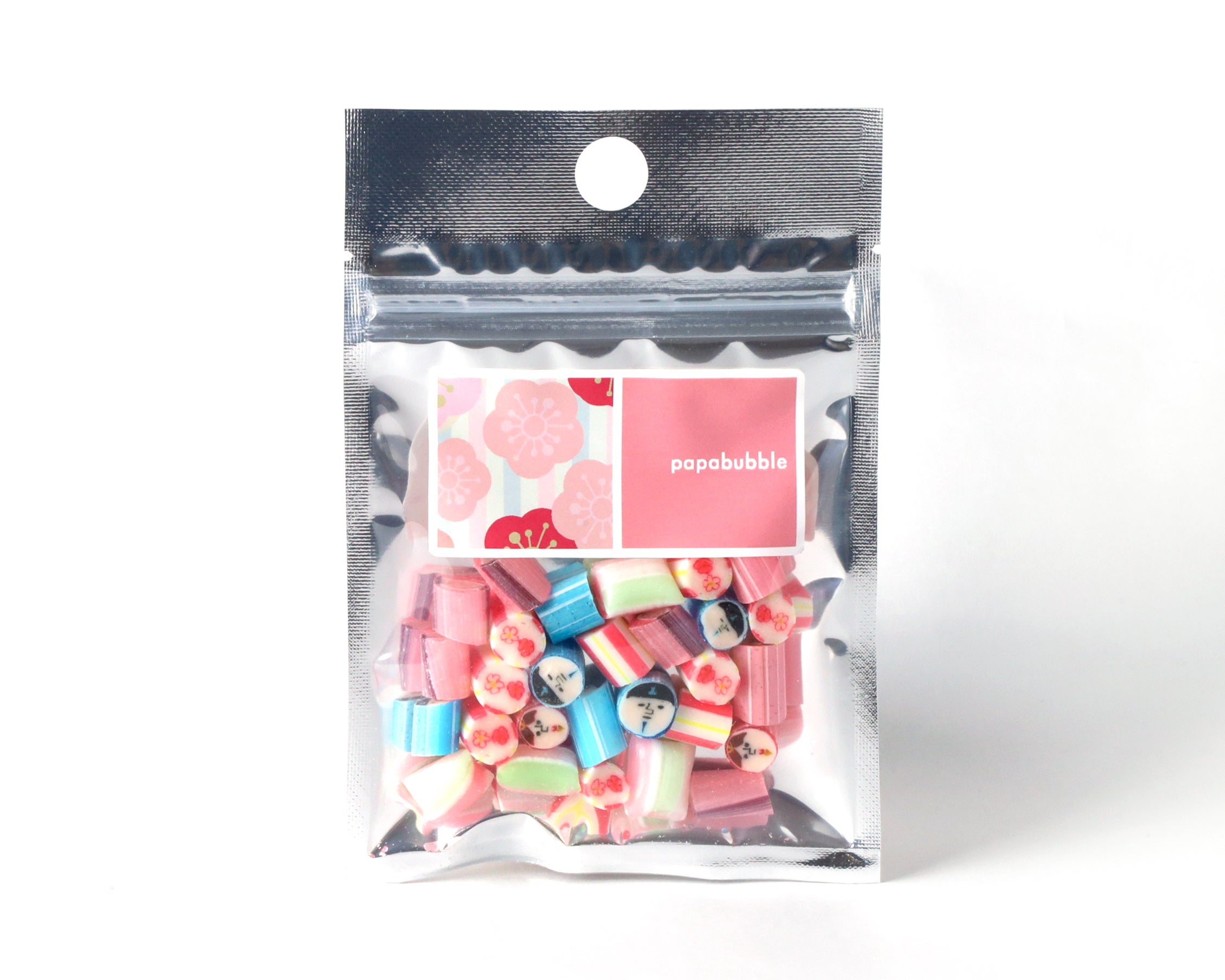 今年のキャンディは、例年とはひと味違う、パパブブレらしい遊び心を加えたデザインが特徴です。ちょっぴりシュールで個性的な表情のお内裏様とお雛様を主役にした、印象的なキャンディに仕上げました。