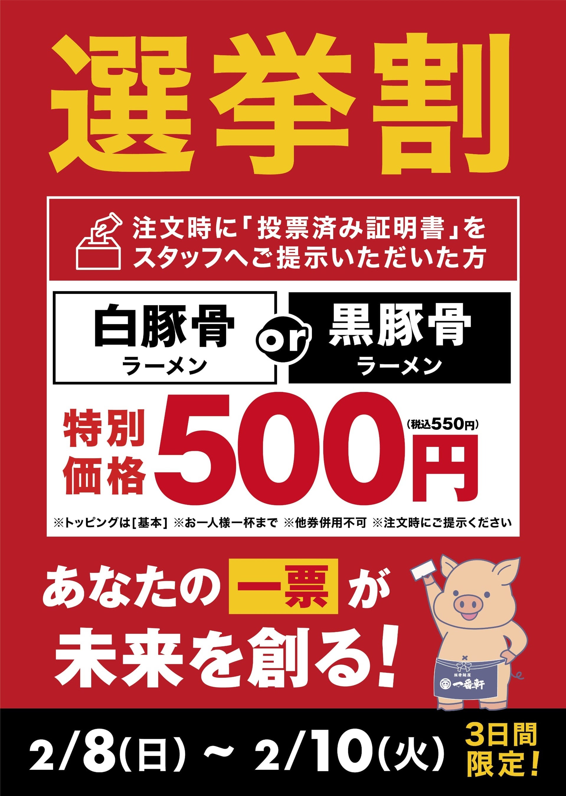 投票済み証明書持参で『白豚骨』または『黒豚骨』ラーメンが550円(税込)に!あなたの一票を、美味しさで応援!