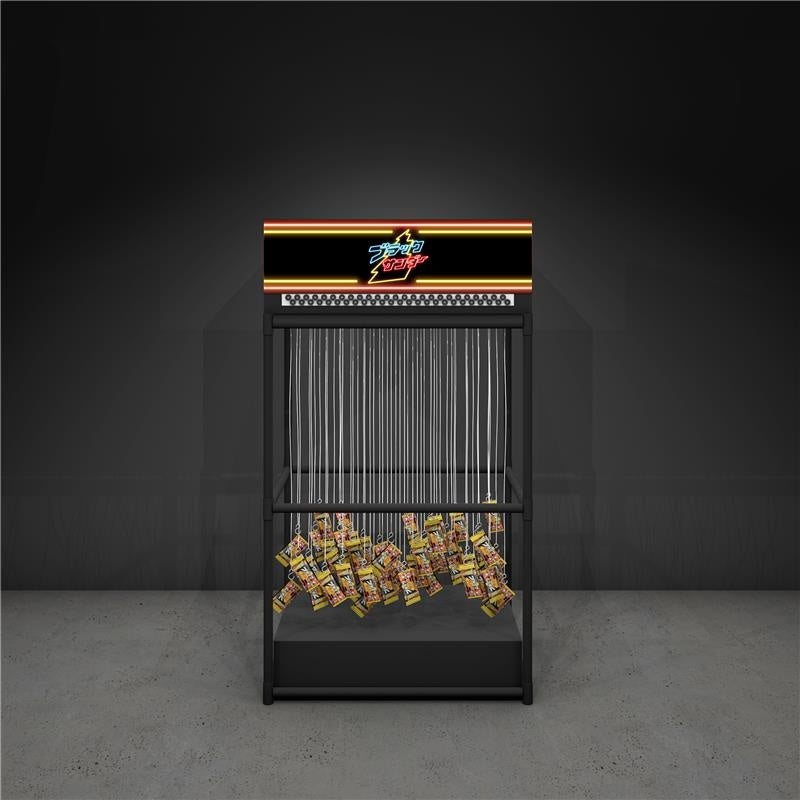 ブラックサンダーを景品にした、オリジナル仕様のクレーンゲームです。制限時間内は、クレーンゲームを自由に操作することができます。アームの動きを見極めながら狙いを定め、制限時間内にブラックサンダーの獲得を目指すゲームです。