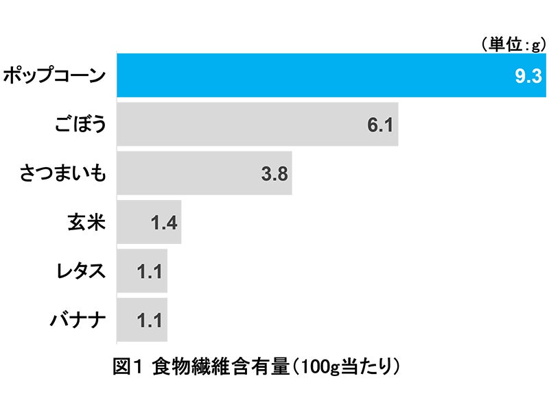 ポップコーン市場は好調に推移しており、その背景には社会的な健康志向の高まりが関係しています。ポップコーンには、豊富な食物繊維が含まれていることが分かっており (図1) 、『マイクポップコーン』においては「カラダにうれしいポイント」として、2018年よりパッケージにレタス約2個分(※2)の食物繊維が含まれるアイコンの掲載を開始しました。