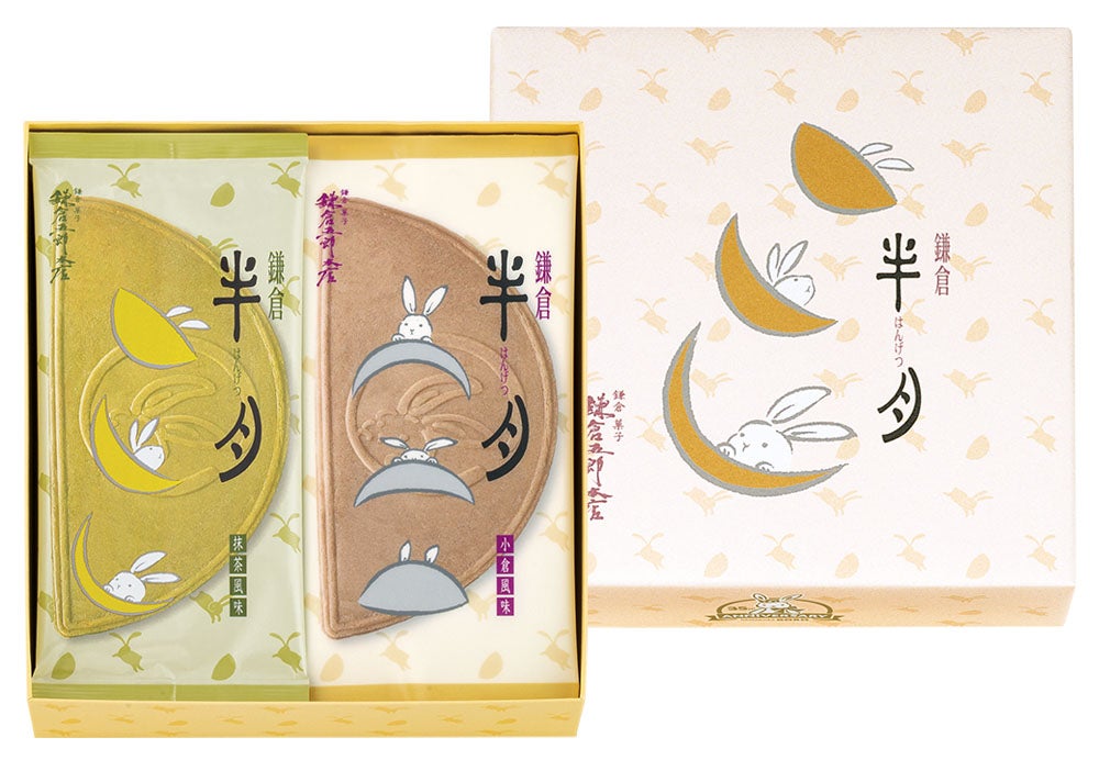 鎌倉五郎本店を代表する、大人気の鎌倉銘菓といえばコレ!月うさぎを描いた大きな半月のおせんべいに、ふわっと軽いクリームがたっぷりはさまれた『鎌倉半月』です。カリッと「おいしい音」がする、ほかにない香ばしい食感は、お子様からご年配まで圧倒的支持をうけています。定番の小倉風味と抹茶風味をご堪能ください。