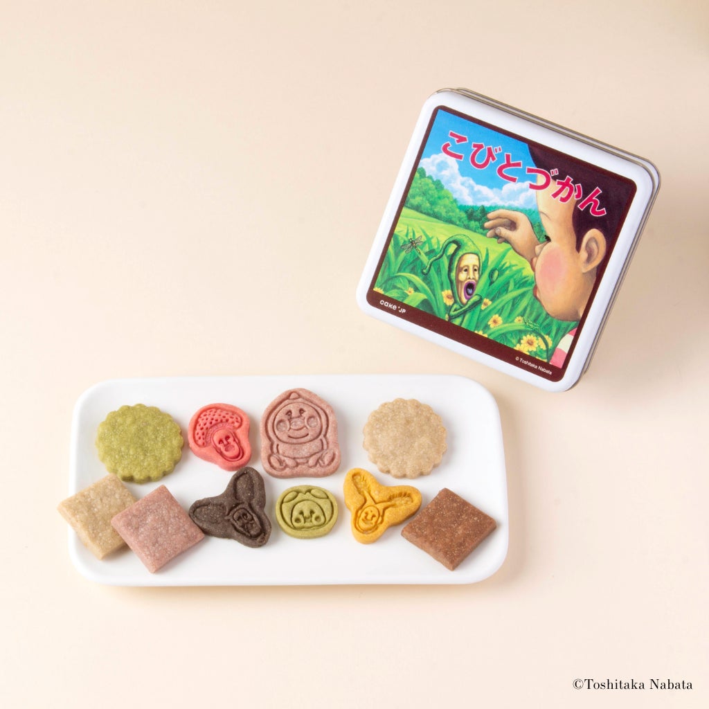 「こびとづかん」20周年を記念した特別なコラボレーションで、2006年に発売された最初の絵本『こびとづかん』表紙をそのまま缶のデザインに採用。カクレモモジリ、ホトケアカバネ、スモモノウチなど人気のコビトたちを型抜きクッキーで表現しました。