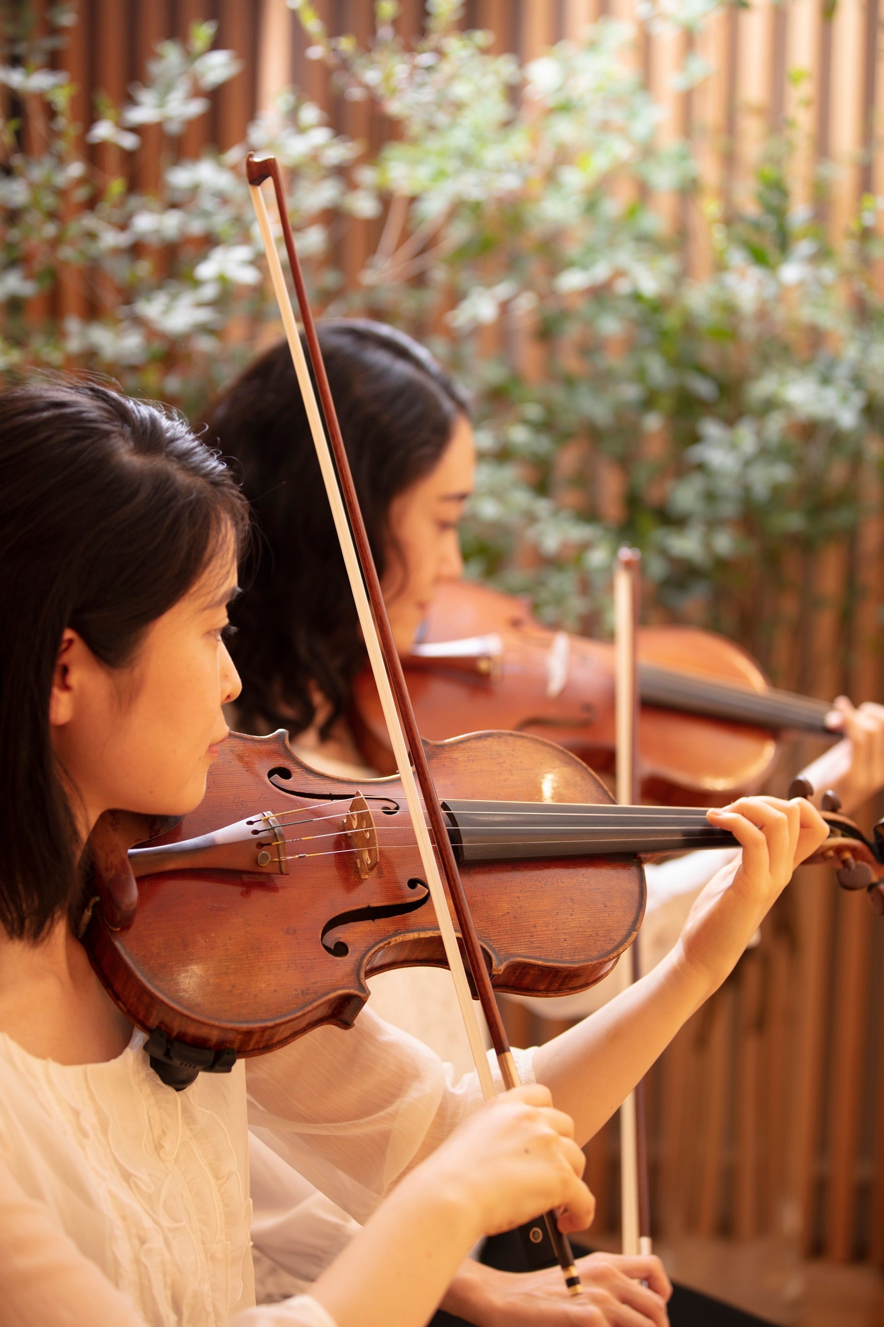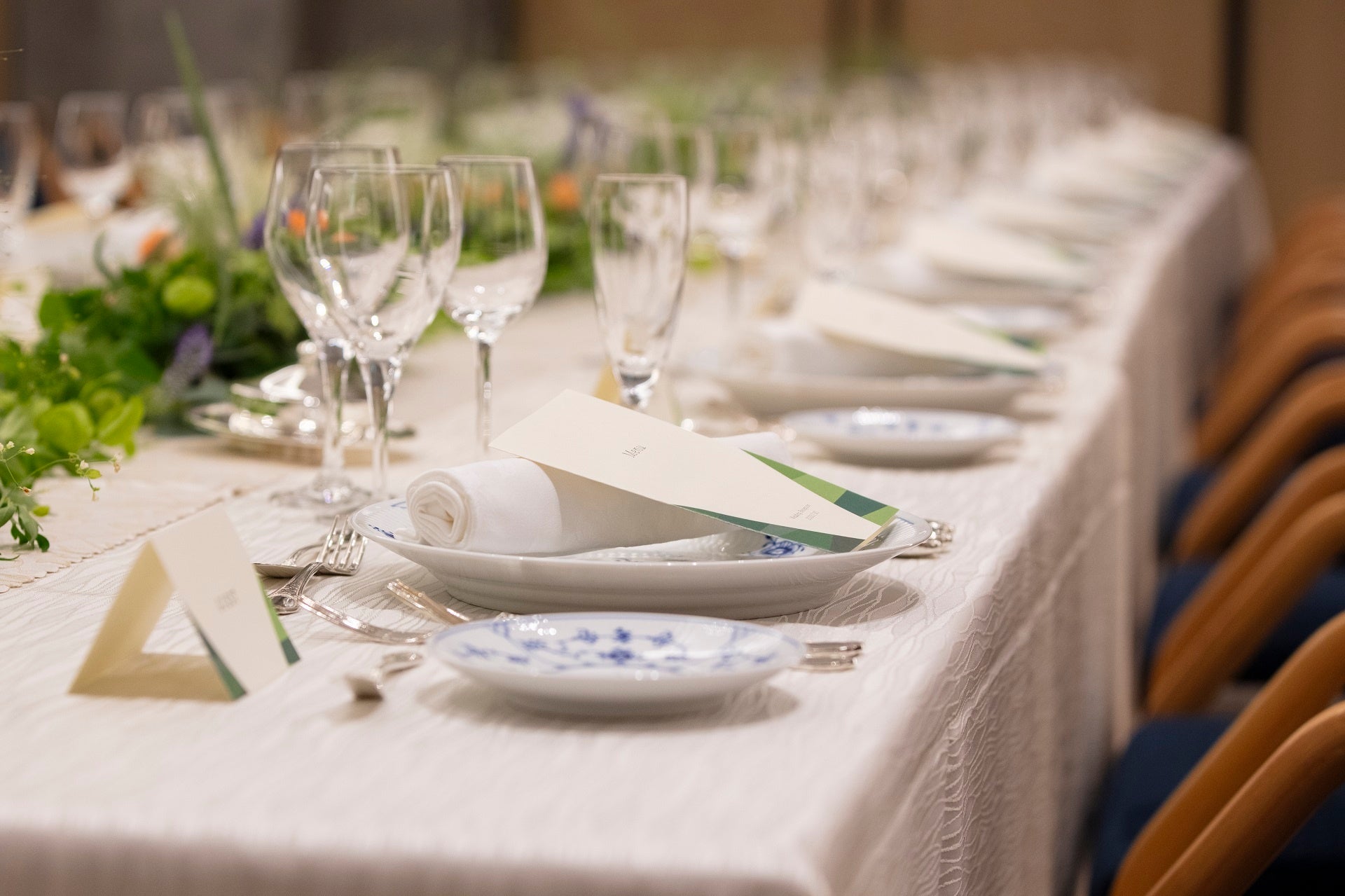 音は、記憶を仕舞ってくれます。この素晴らしい瞬間を包み込むのは、北欧に伝わる祝福の弦楽四重奏。おふたりの新たな物語も、家族が受け継いできた時の重なりも、大切につなぐ、音楽結婚式。古くからデンマークで使われてきた椅子、壁面に咲くダリアのタイシルク、積み重ねてきた時間と最高の今が交差します。