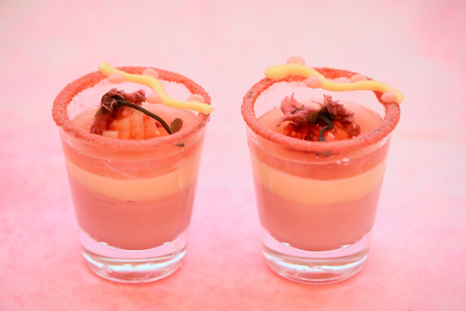 苺プリンと桜プリンを美しい層に仕立て、桜ジュレを重ねた春色のデザート。