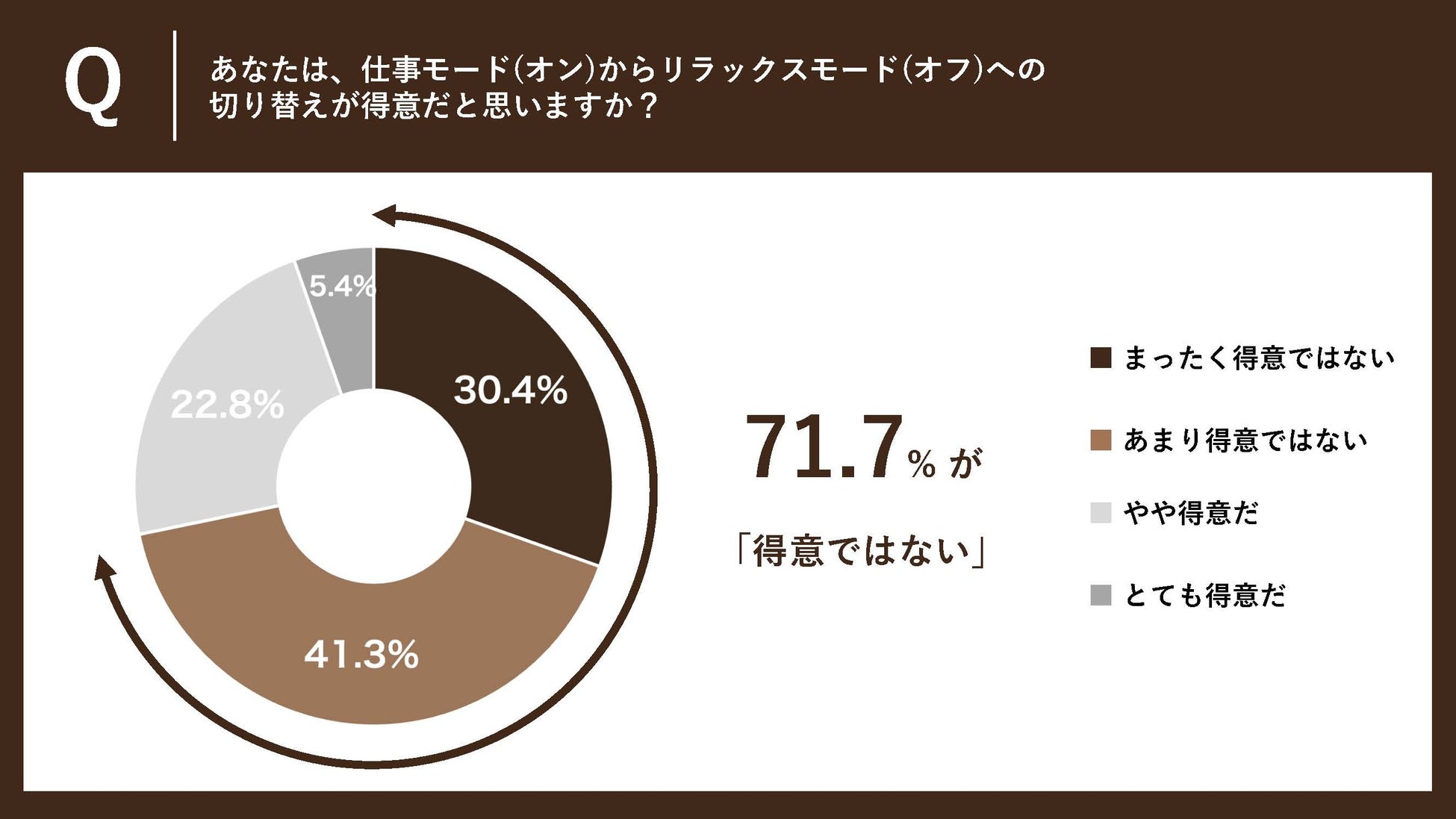 「Q.あなたは、仕事モード(オン)からリラックスモード(オフ)への切り替えが得意だと思いますか?」という質問では、71.7%が「苦手(あまり得意ではない・まったく得意ではない)」と回答しました。 常に気を張っている状態が続くあまり、素の自分に戻るタイミングや方法を見失っている女性が多いことが推測されます。