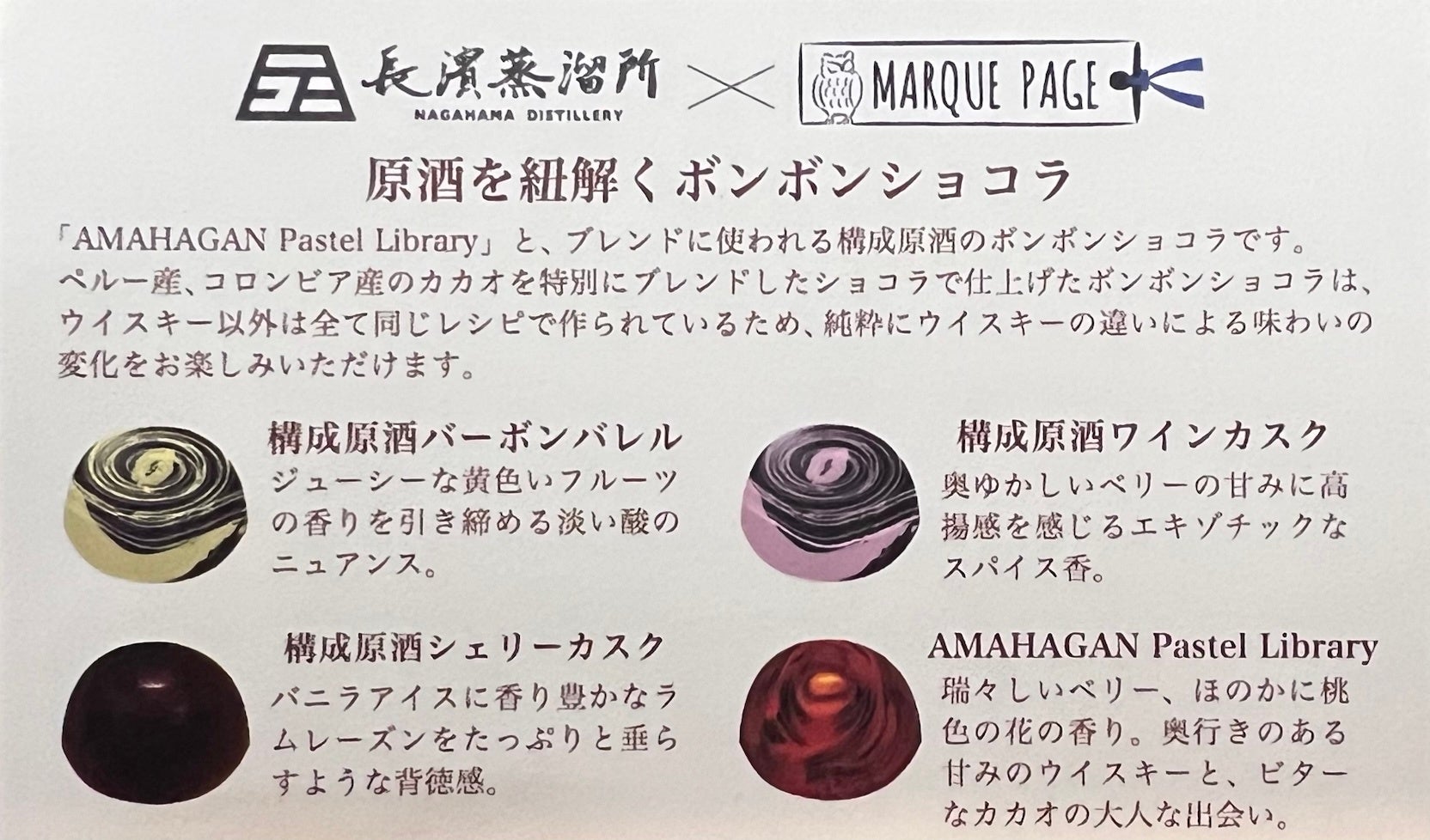 長濱蒸溜所から、ブレンディングの深淵を体験する特別なセットが誕生しました。新作ワールドブレンデッドモルトウイスキー『AMAHAGAN World Blended Malt Pastel Library(パステル・ライブラリー)』と、その構成原酒を贅沢に使用した「MARQUE PAGE(マルクパージュ)」製ボンボンショコラの共演です。
