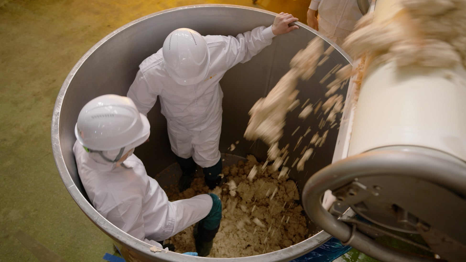味噌踏みをする工程では、初めて味噌踏みをする社員が2トンタンクに2人1組で入り、大豆・米麹・塩の三点を混合した“味噌のもと”が均一に発酵するよう、空気を抜くために全体重をかけて足で踏みならしました。終わる頃には、氷点下の気候を忘れるほどの体の火照りと疲労感。味噌を踏み続ける作業は根気と体力が必要です。味噌踏みの後には、当社ブレンドマイスター※2による味噌のブレンド作業の見学や、当社が過去に販売していた、味噌が入った樽を縄で縛る伝統的な技法も体験しました。