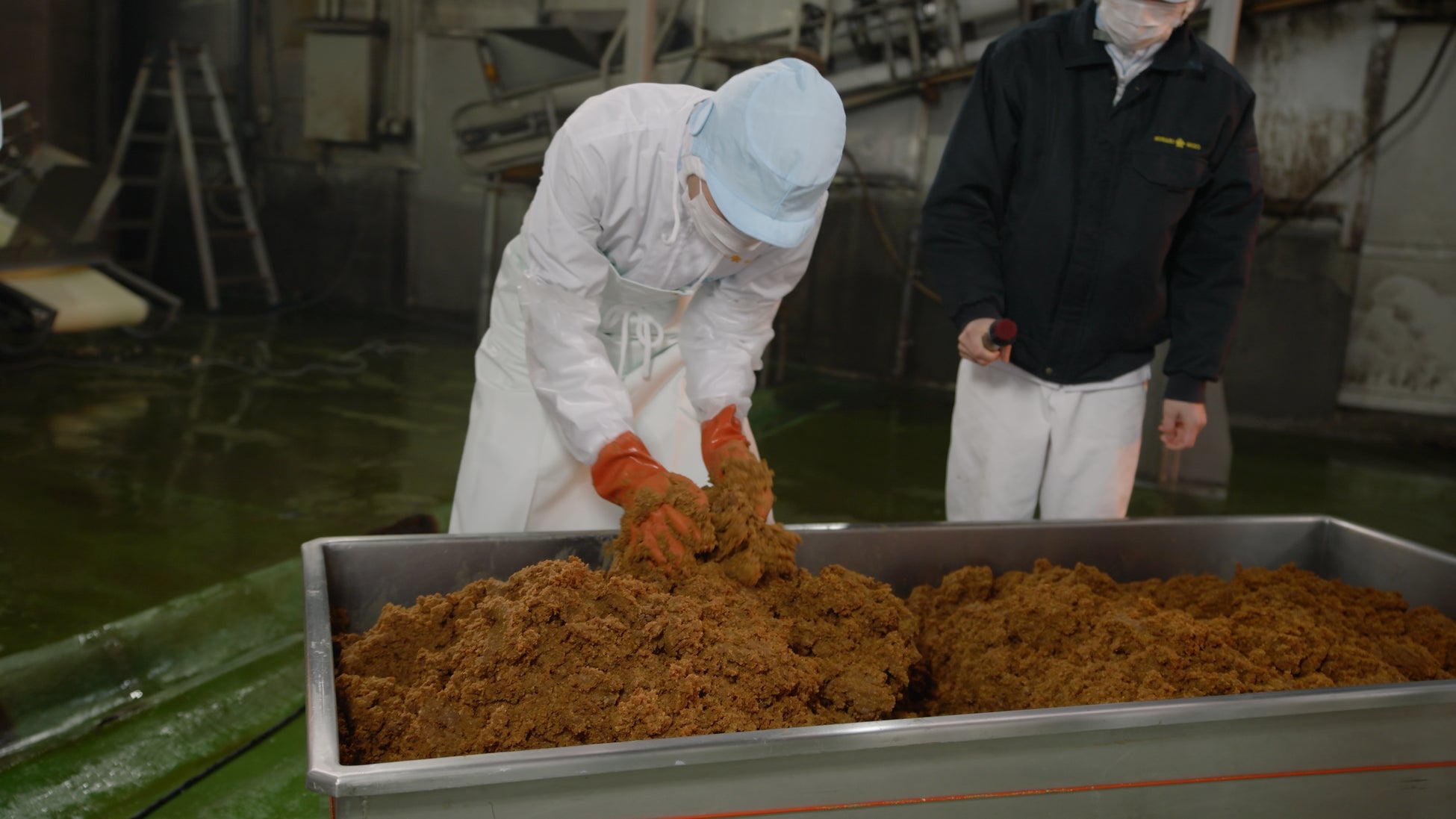「大寒仕込み」とは、前年の秋に収穫した新穀大豆と米を原料とし、二十四節気の大寒の時季に行う伝統的な手法を用いた味噌の仕込みを指します。当社の「大寒仕込み」は、参加者全員で飯島グリーン工場内の醸造の神を祀る松尾大社祠を参拝し1年間の味噌づくりの豊穣と息災、おいしい味噌の仕上がりを祈願することから始まります。今年は、北海道産の大豆「ユキホマレ」と三重県産「コシヒカリ」の米麹、長崎県産の塩「海はいのち」を原料として使用しました。