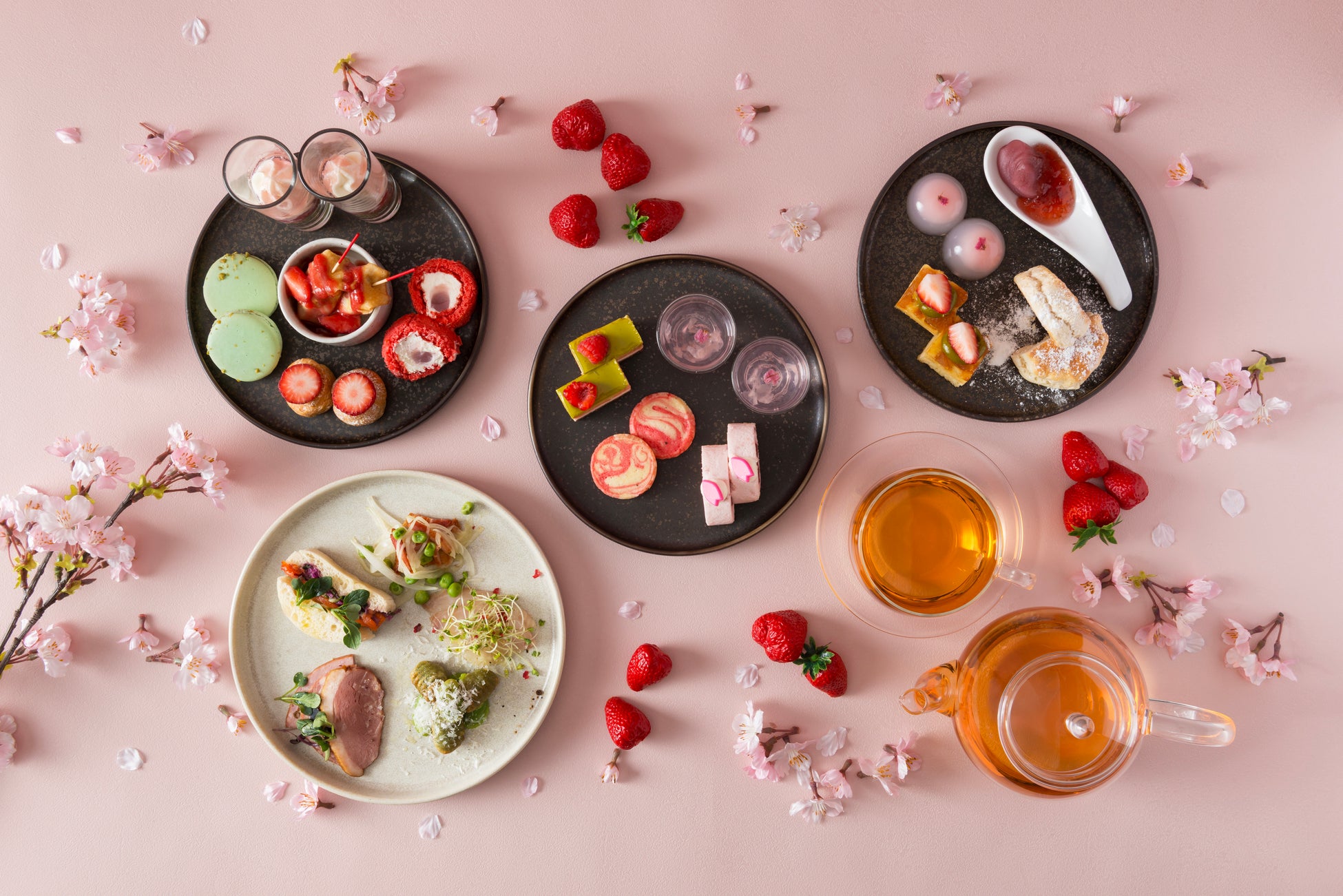 季節ごとの旬に合わせてご提供するアフタヌーンティー。2026年3月~4月は「いちご×桜」をテーマに、みずみずしい旬のいちごをはじめ、各店舗の個性を活かしたスイーツやセイボリーをご用意いたしました。