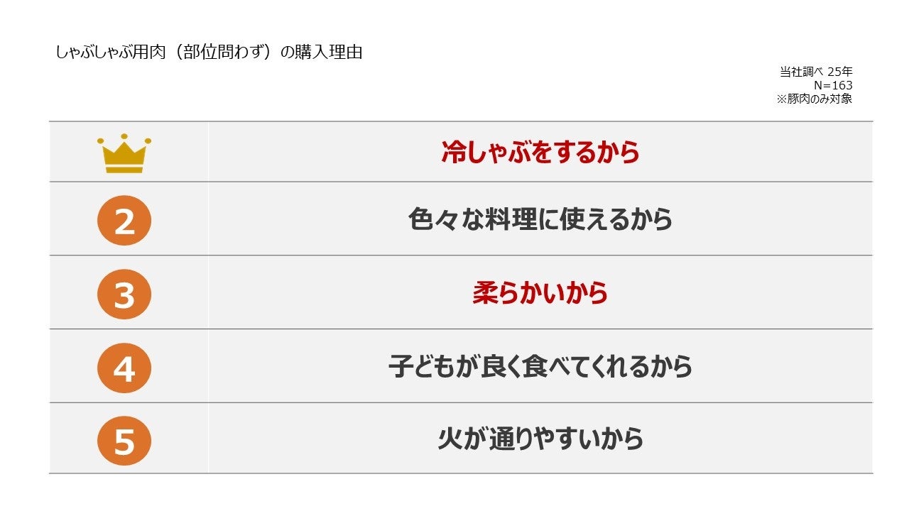 しゃぶしゃぶ用肉の購入頻度は高く、購入理由としても「冷しゃぶをするから」「柔らかい」といった点が挙げられます(当社調べ 2025年 N=163)。冷しゃぶに新たな要素を加え、よりボリューム感がありながら、暑い夏でも食べやすいメニューを目指しました。冷たい麺料理のような涼やかさを表現するため、春雨を加え、これまでの豚しゃぶにはない新しい食感を取り入れています。