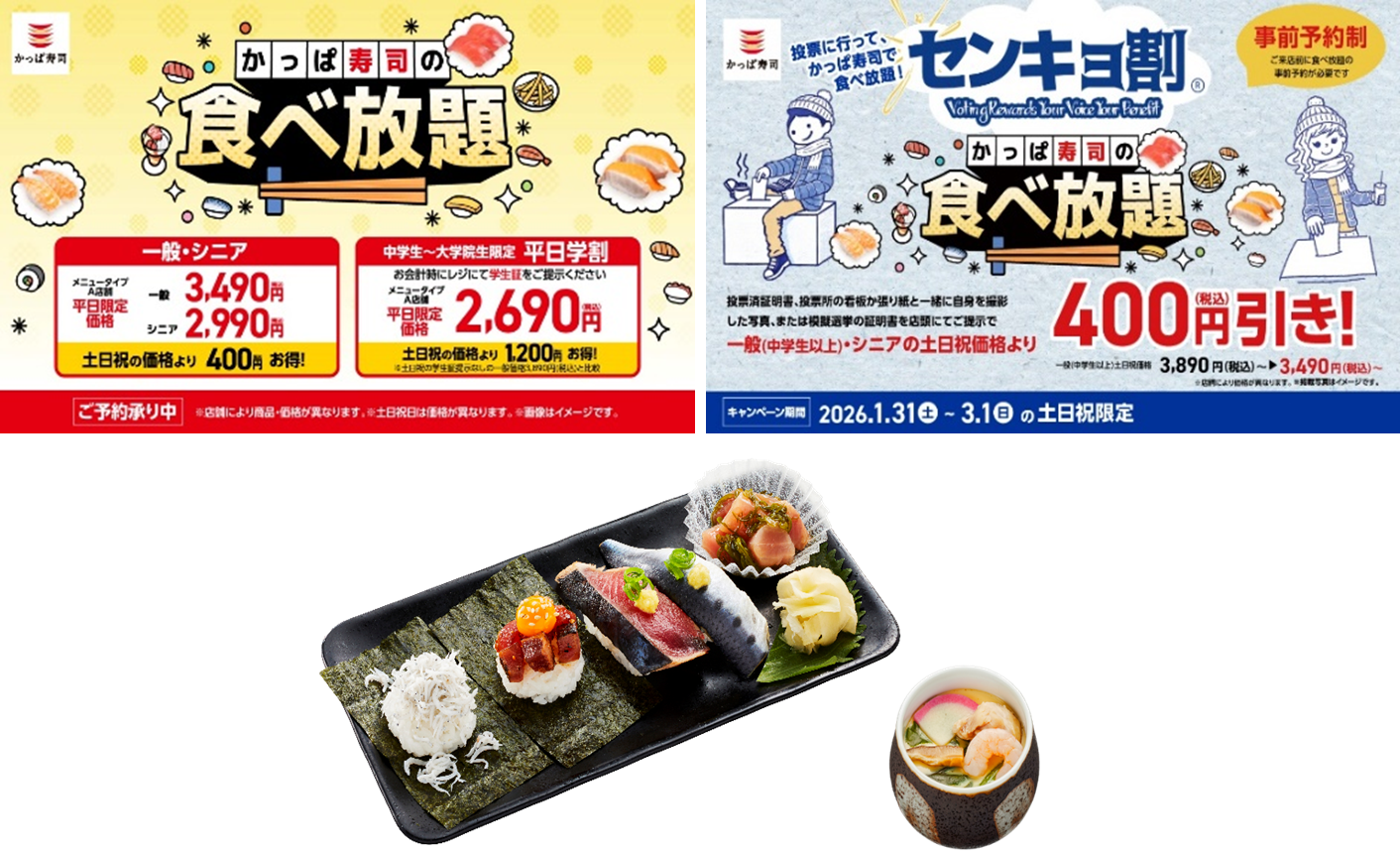 幼児無料※1、平日学割、平日価格※2、「センキョ割」も継続中!販売期間:2026年2月5日(木)~2月25日(水)予定、全国のかっぱ寿司にて