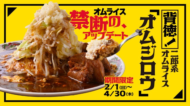 “背徳の最高到達点”を目指し、やみつき系の代名詞「ラーメン二郎」のあの高揚感をオムライスにギュッと凝縮!ガツンと旨い、罪深い美味しさの二郎系オムライス「オムジロウ」を、2月5日(木)~4月30日(木)の期間限定でお楽しみいただけます!
