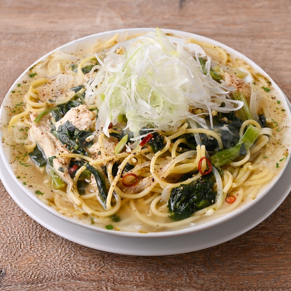 長ネギと蒸し鶏の和風ペペロンチーノ