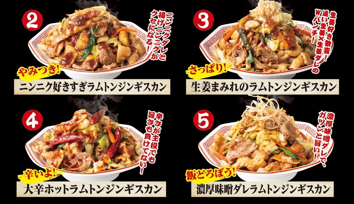 味は、豆板醤の入った甘じょっぱいスタンダードな特製ダレの『恋するラムトンジンギスカン』。その上にニンニクダレと揚げニンニクをトッピングした病みつきになる味『ニンニク好きすぎラムトンジンギスカン』。生姜ダレと追い生姜でさっぱり食べれる『生姜まみれのラムトンジンギスカン』。唐辛子で辛さ倍増『大辛ホットラムトンジンギスカン』。濃厚味噌でごはんが進む『濃厚味噌ダレラムトンジンギスカン』の全5種類。どれも濃いめの旨辛味で、ごはんにもおつまみにもおすすめです。