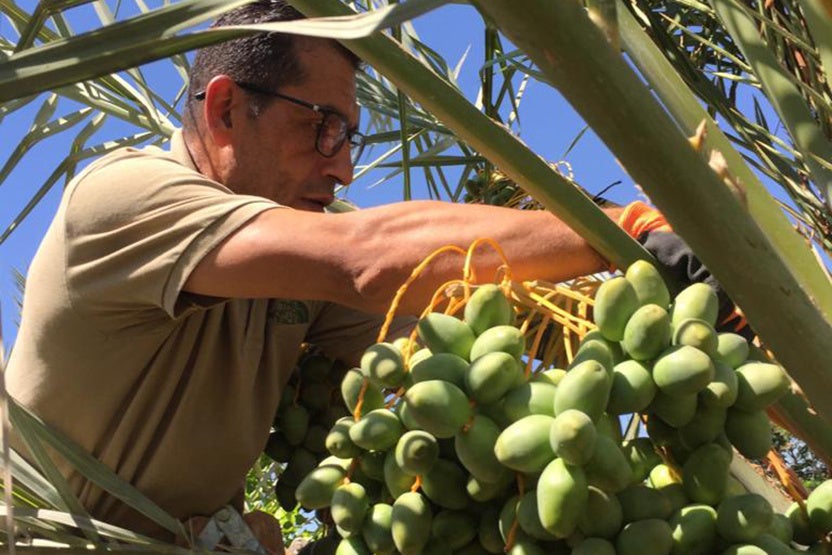 ヨルダン川渓谷では、マジョール・デーツは9月から10月にかけて収穫期を迎えます。収穫された果実は加工場に運ばれ、熱風と冷却によって虫や微生物が処理されたあと表面のクリーニングを行い、大きさや表面のしわの程度などで選別され、パッキングされます。デーツはドライフルーツでありながらも、木に実ったまま太陽の力で完熟し、自然に乾燥します。