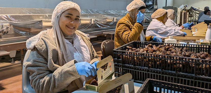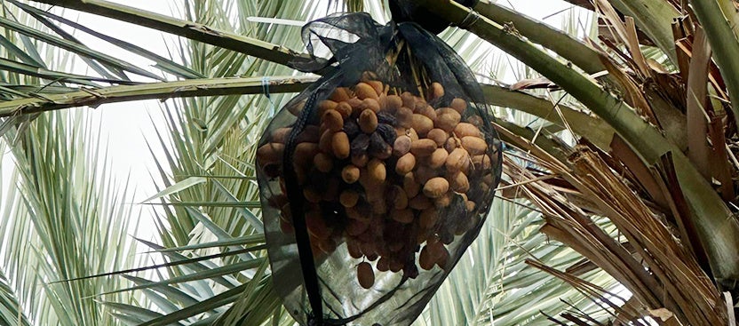 ヨルダン川渓谷では、マジョール・デーツは9月から10月にかけて収穫期を迎えます。収穫された果実は加工場に運ばれ、熱風と冷却によって虫や微生物が処理されたあと表面のクリーニングを行い、大きさや表面のしわの程度などで選別され、パッキングされます。デーツはドライフルーツでありながらも、木に実ったまま太陽の力で完熟し、自然に乾燥します。