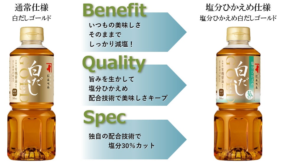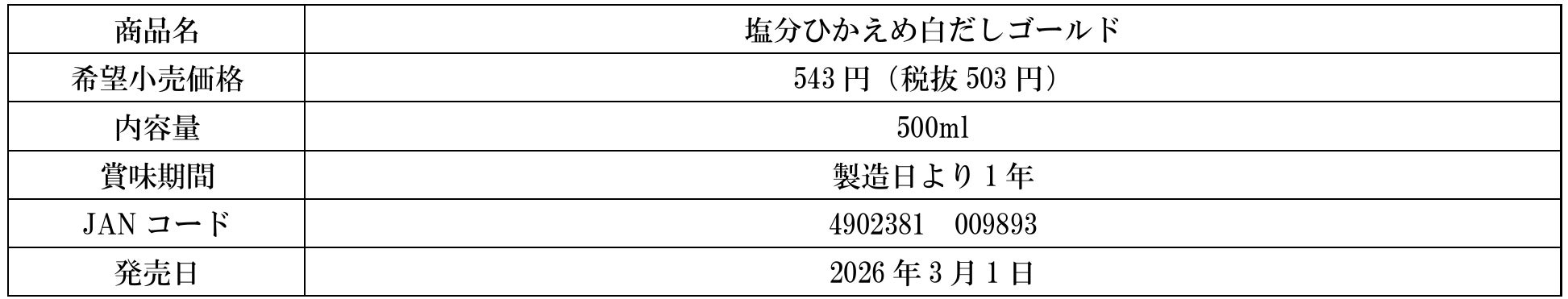 株式会社にんべん(東京都中央区、代表取締役社長 髙津伊兵衛)は、ゴールドシリーズ「塩分ひかえめ白だしゴールド」を300mlから500mlへ容量変更し、2026年3月1日(日)に全国でリニューアル発売いたします。近年、白だし市場が伸長傾向にあり、さらに食塩摂取量の削減が推奨される中、「塩分ひかえめ白だしゴールド」の販売実績は好調に拡大しています。こうした市場環境とお客様からのご好評を受け、従来のトライアルサイズ(300ml)から容量を増量し、より高まる需要にお応えできるようにリニューアルいたしました。本醸造有機醤油と国内製造・国産のだし素材をレギュラー品(当社「白だし」)の1.5倍使用し、美味しさはそのままに塩分を30%カット。減塩を意識した食卓をしっかりとサポートします。