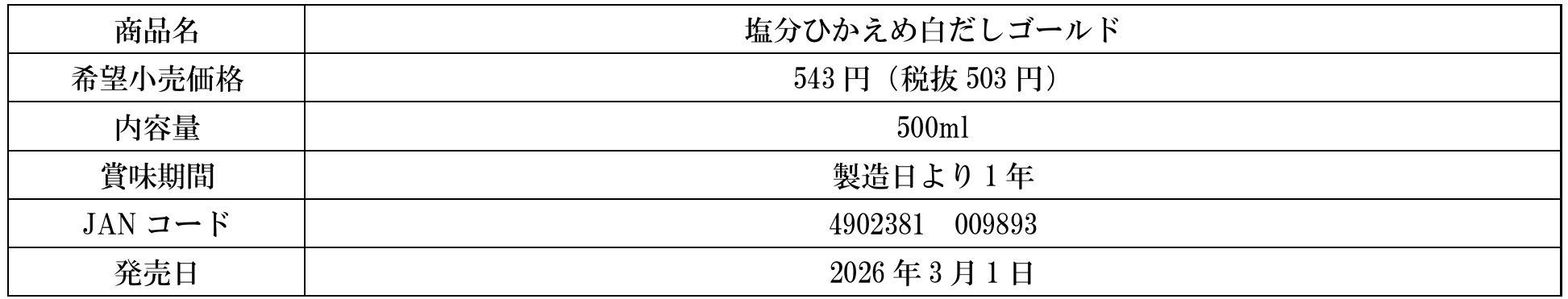 株式会社にんべん(東京都中央区、代表取締役社長 髙津伊兵衛)は、ゴールドシリーズ「塩分ひかえめ白だしゴールド」を300mlから500mlへ容量変更し、2026年3月1日(日)に全国でリニューアル発売いたします。近年、白だし市場が伸長傾向にあり、さらに食塩摂取量の削減が推奨される中、「塩分ひかえめ白だしゴールド」の販売実績は好調に拡大しています。こうした市場環境とお客様からのご好評を受け、従来のトライアルサイズ(300ml)から容量を増量し、より高まる需要にお応えできるようにリニューアルいたしました。本醸造有機醤油と国内製造・国産のだし素材をレギュラー品(当社「白だし」)の1.5倍使用し、美味しさはそのままに塩分を30%カット。減塩を意識した食卓をしっかりとサポートします。