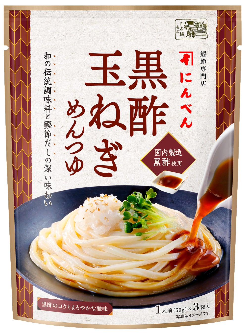 国産玄米を100%使用した黒酢のコクと国産玉ねぎの甘味をきかせたまろやかな酸味が特徴のめんつゆです。黒酢のほどよい酸味に、鰹節の旨みが加わり、味に深みが生まれます。蒸し鶏やなす、温玉に加え、大根おろしなどもトッピングにおすすめです。