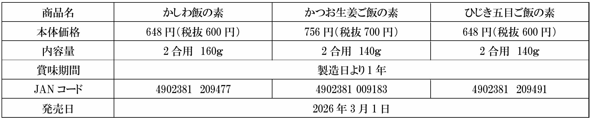 株式会社にんべん(東京都中央区、代表取締役社長 髙津伊兵衛)は、混ぜご飯の素シリーズ「素材を愉しむ混ぜご飯の素」の定番品3品(かしわ飯の素・かつお生姜ご飯の素・ひじき五目ご飯の素)と、季節限定品2品(ちりめん山椒ご飯の素・新生姜ご飯の素)の計5品を、2026年3月1日(日)より順次リニューアル発売いたします。従来のだし原料「かつお枯節だし」(一部荒節使用)から、約半年もの時間をかけて作られる、香り豊かな本枯鰹節を使用した「本枯鰹節だし」(一部本枯鰹節砕片使用)へリニューアルいたしました。これにより、鰹節専門店にんべんならではの深い味わいをより一層お楽しみいただけます。