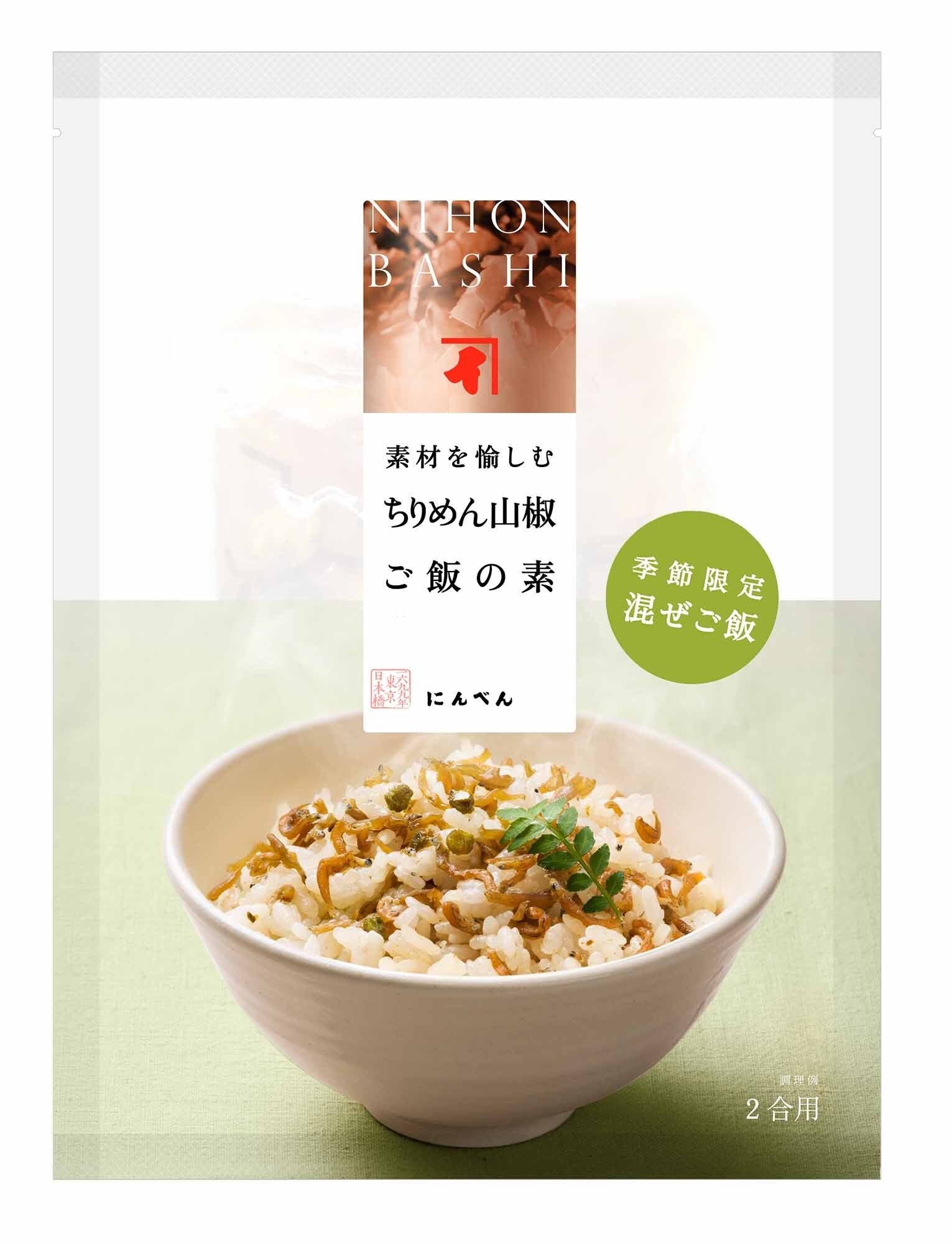 具材には、国産の香り高い実山椒と、国内で水揚げされたいわし類を使ったちりめんを使用し、本枯鰹節だしと厳選素材が織りなす、和の風味を存分に味わえる混ぜご飯をご家庭で手軽に召し上がりいただけます。