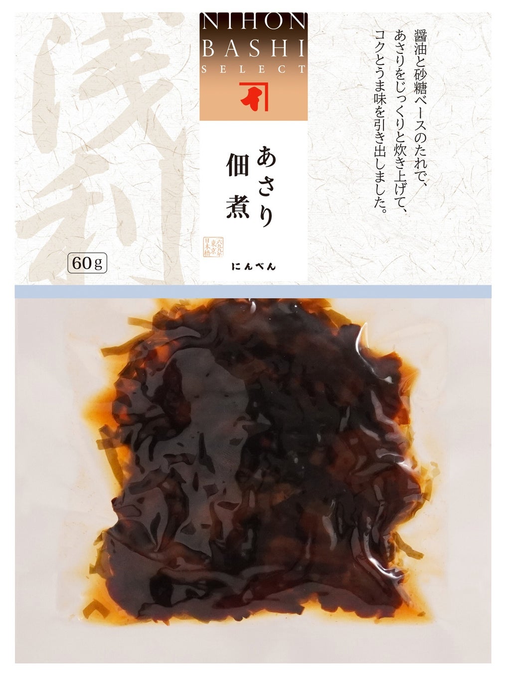 丁寧に蒸しあげたあさりを使用し、かつおと昆布の合わせだしをきかせた醤油と砂糖をベースにしたたれでふっくら炊き上げました。旨さ引き立つ細切り昆布が入った食欲をそそる味わい深いあさりの佃煮です。