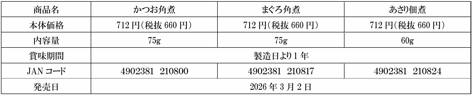 株式会社にんべん(東京都中央区、代表取締役社長 髙津伊兵衛)は、角煮・佃煮シリーズ「かつお角煮」「まぐろ角煮」「あさり佃煮」の3品を、2026年3月2日(月)よりリニューアル発売いたします。創業300余年の鰹節専門店としての知見を活かし、かつおやまぐろのなまりぶし、ふっくら蒸しあげたあさりなど、それぞれ厳選した素材を使用。醤油と砂糖をベースとしたたれでじっくり炊き上げることで、素材本来のコクと旨みを最大限に引き出しています。またパッケージも、中身が見える袋仕様へ変更いたしました。素材の魅力がより伝わりやすく、日常使いの品物として手に取っていただきやすいデザインへと一新いたしました。