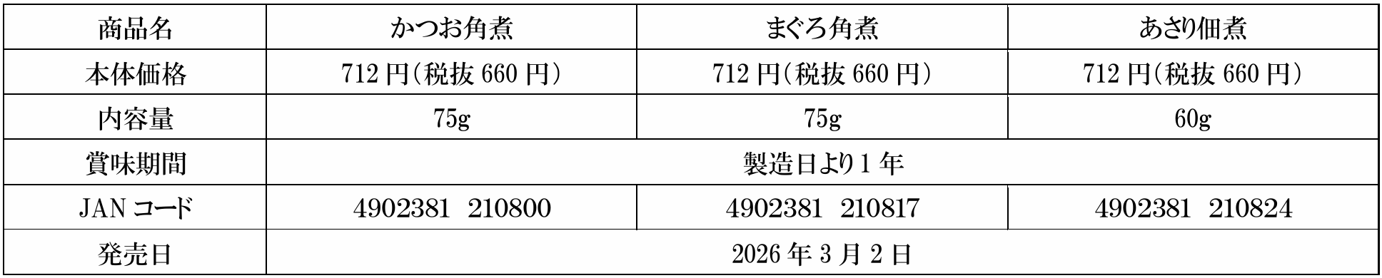 株式会社にんべん(東京都中央区、代表取締役社長 髙津伊兵衛)は、角煮・佃煮シリーズ「かつお角煮」「まぐろ角煮」「あさり佃煮」の3品を、2026年3月2日(月)よりリニューアル発売いたします。創業300余年の鰹節専門店としての知見を活かし、かつおやまぐろのなまりぶし、ふっくら蒸しあげたあさりなど、それぞれ厳選した素材を使用。醤油と砂糖をベースとしたたれでじっくり炊き上げることで、素材本来のコクと旨みを最大限に引き出しています。またパッケージも、中身が見える袋仕様へ変更いたしました。素材の魅力がより伝わりやすく、日常使いの品物として手に取っていただきやすいデザインへと一新いたしました。