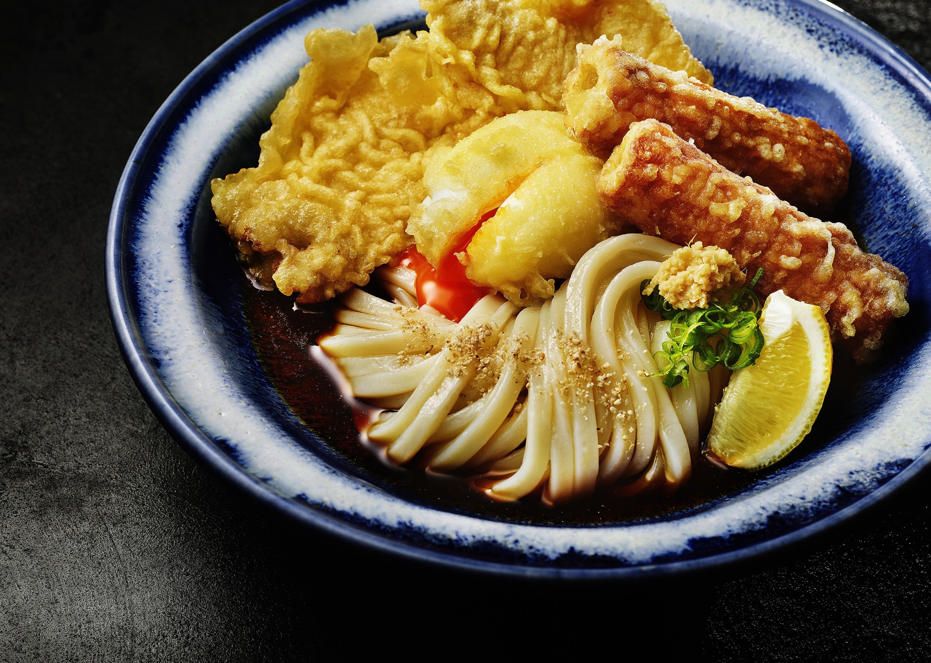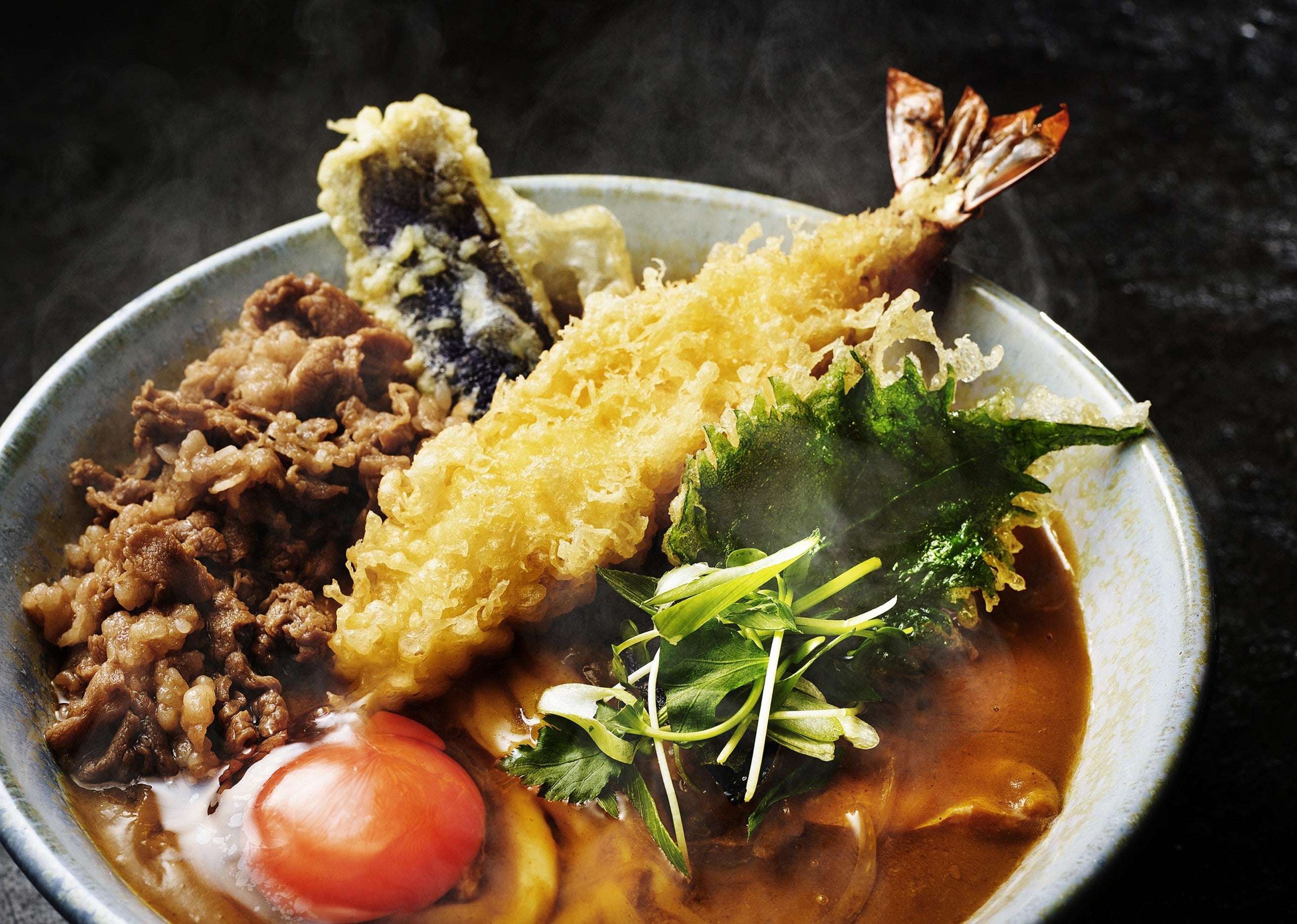 天然大海老天などの天ぷらをはじめ、国産牛や卵黄を豪快にのせたボリューム満点のカレーうどん