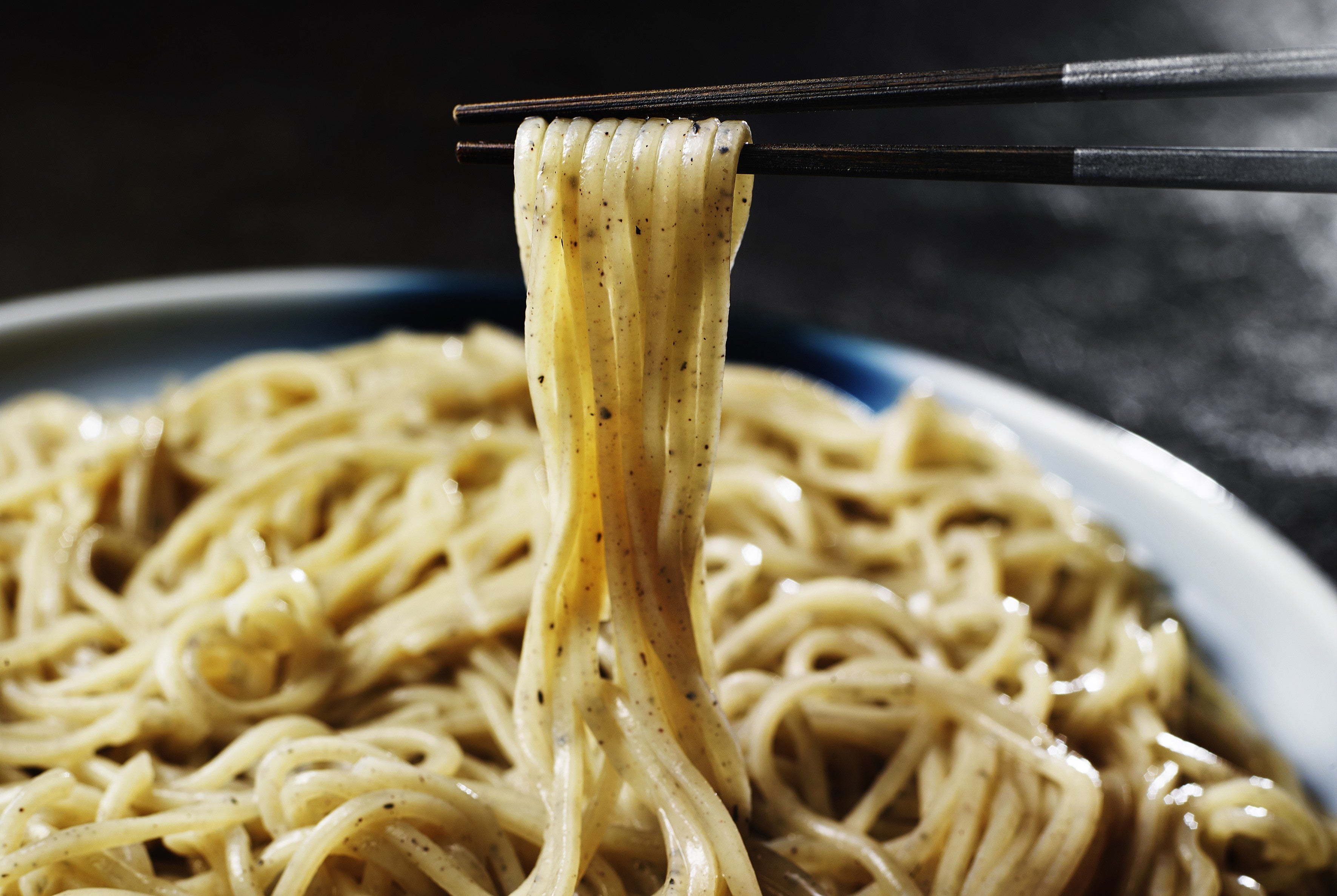黒胡麻など十種以上の雑穀を練り込んだ細打ち麺。御影石のような