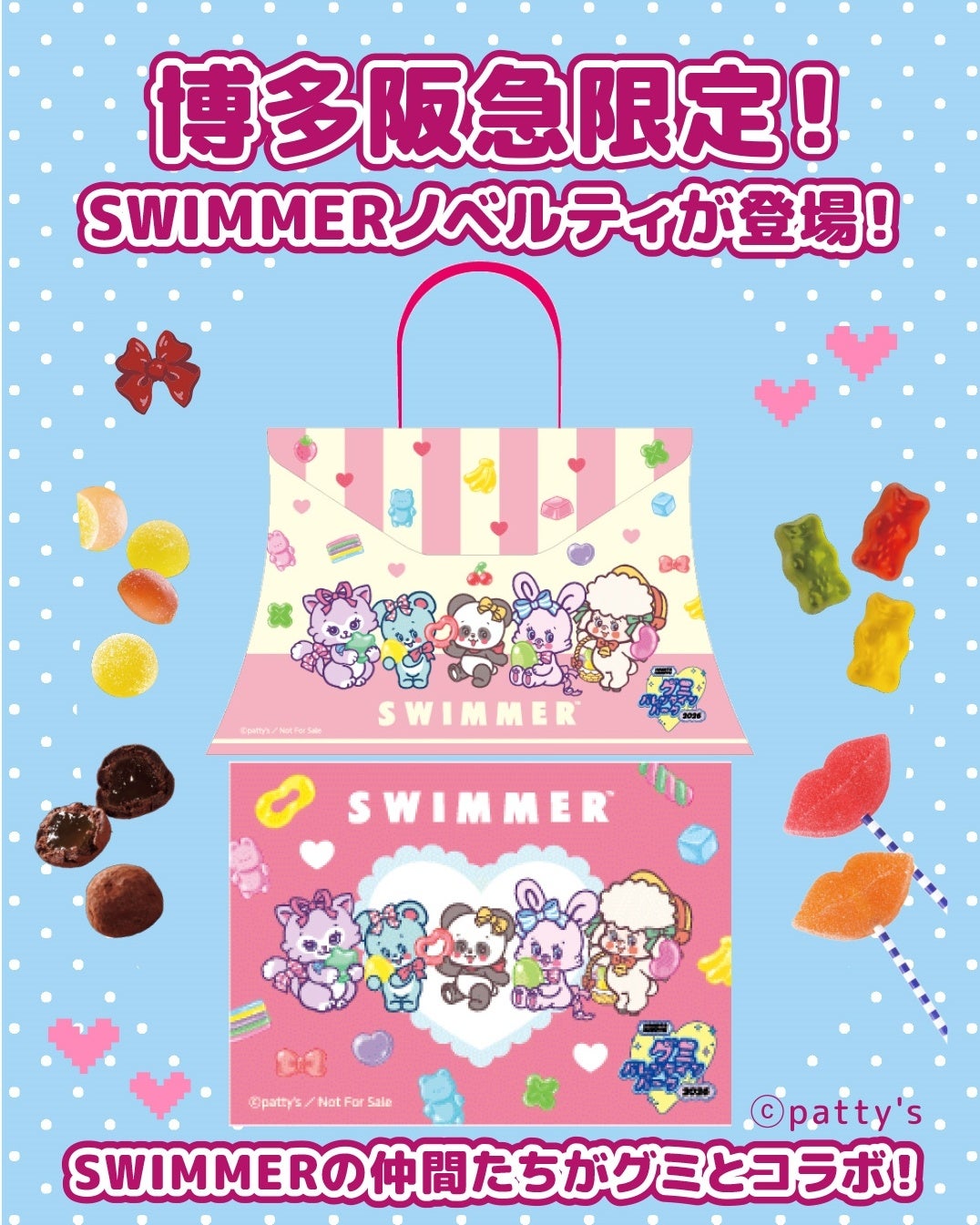 アイピーフォー株式会社(本社:東京都豊島区、代表取締役社長:小濵 剛)がライセンスを取り扱っている大人気雑貨ブランド「SWIMMER」が、博多阪急で行われるイベント「グミバレンタインパーク」とコラボレーション!SWIMMERデザインのグミの持ち帰りBOXや特典のほか、バレンタインにグミと一緒に贈りたくなるようなSWIMMERのグッズコーナーも展開♡2026年2月4日(水)~2月14日(土)まで、博多阪急1階 メディアステージにて開催です。ぜひチェックしてみてください♪