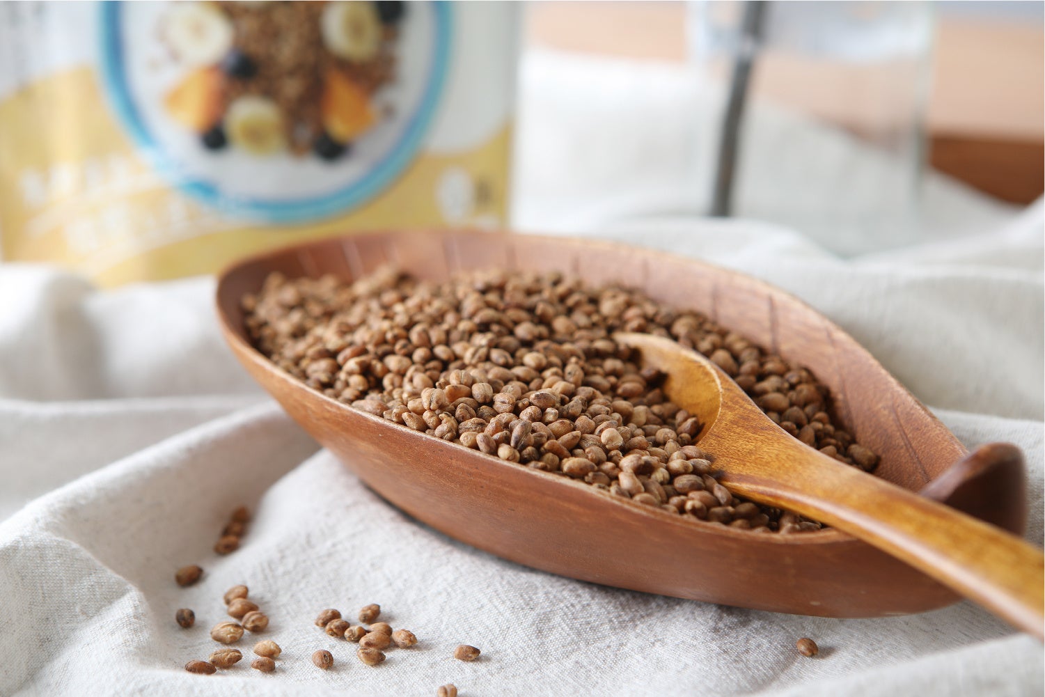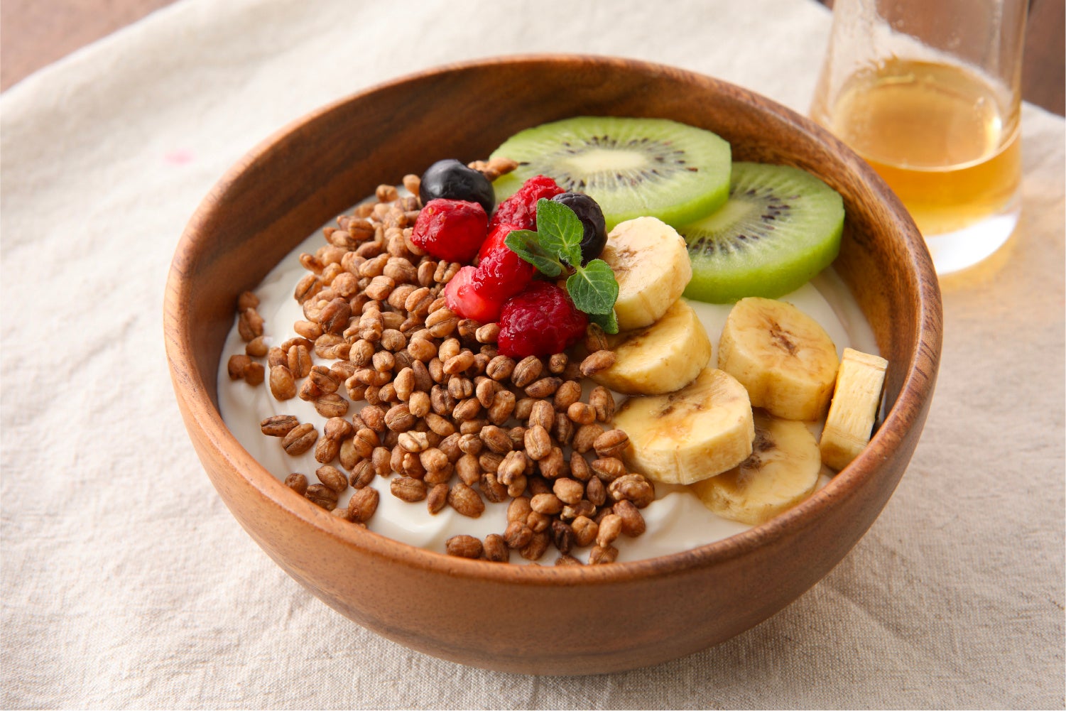 もちむぎシリアルに使用しているもちむぎは、水溶性食物繊維と不溶性食物繊維をバランスよく含む穀物として知られています。さらには、善玉菌のエサになるとされる発酵性食物繊維を含む点が注目されています。