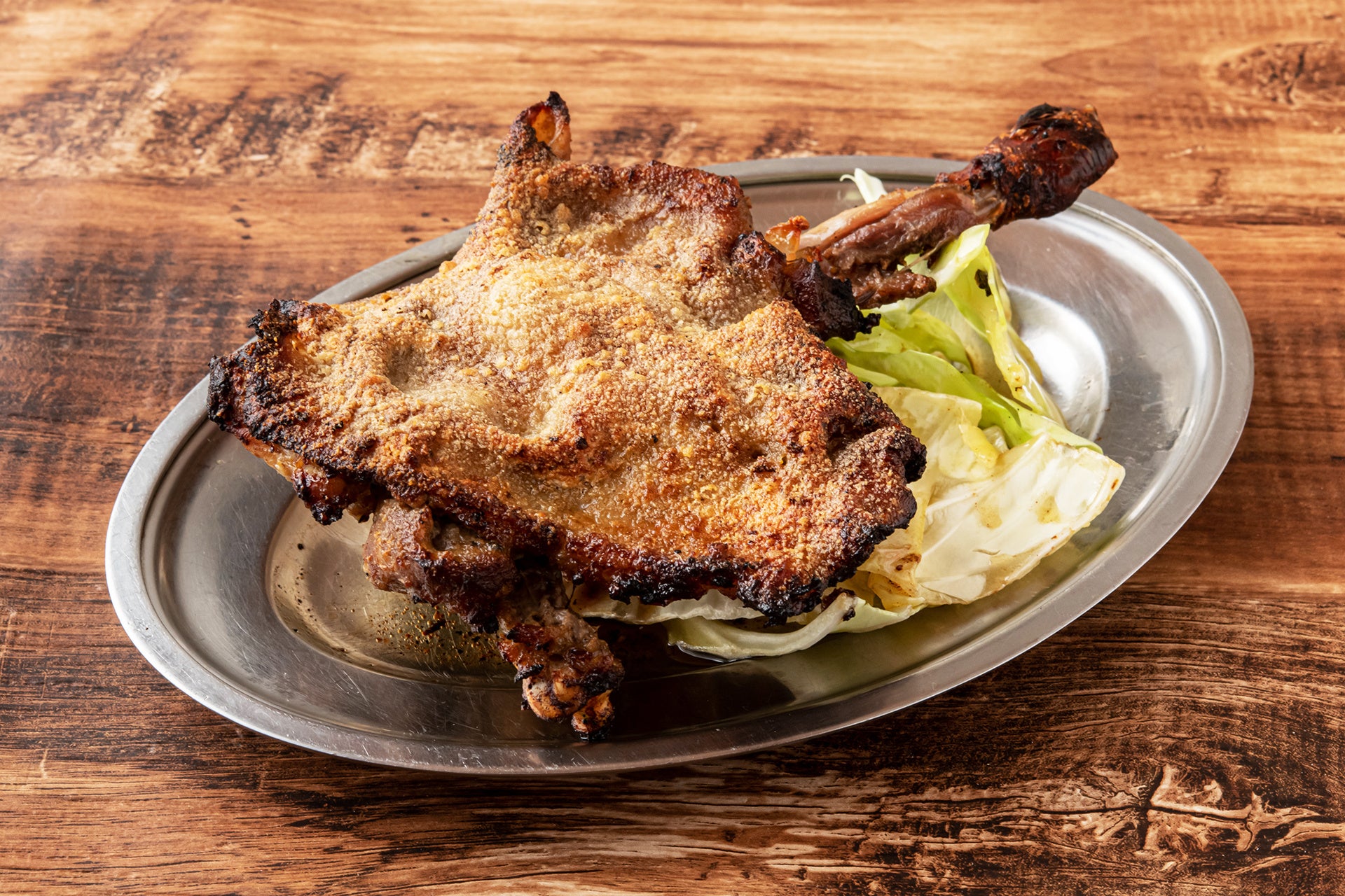 にんにく、しょうゆ、ブラックペッパーなどを使った特製の調味液に漬け込んで焼き上げた一品。