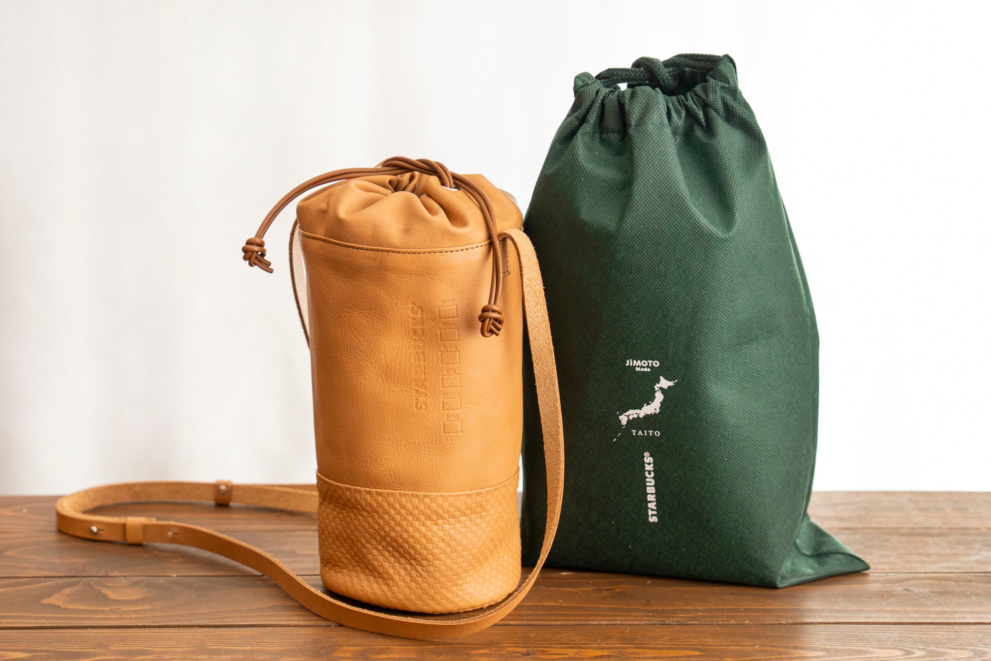 今回、久保柳商店が『JIMOTO Made レザーボトルショルダーバッグ台東』のために選定した皮革は、植物タンニンなめしとクロムなめしのハイブリッドで、無垢に近い自然な風合いの牛革。まるでスターバックス ラテのようなやわらかな色味に染色された革は、使う人によって一人ひとり異なる風合いの変化や艶を楽しむことができます。バッグの形状は、スターバックスのペーパーカップを思わせるフォルムで、コーヒーを入れたボトルなども持ち運べる巾着仕様のレザーボトルショルダーバッグに仕立てました。きれいな円柱にするために縫製の工程で職人がヘリ返しを行い、胴体部分と下部がまるで1枚の革のように思わせるなめらかな仕上がりに、熟練した職人の技術を生かしたつくりになっています。また、胴体部分にはスターバックスのカップに印刷しているドリンクボックスのデザイン、下部には台東区をイメージした市松模様を型押しすることで、スターバックスと台東区とのつながりを表現しました。