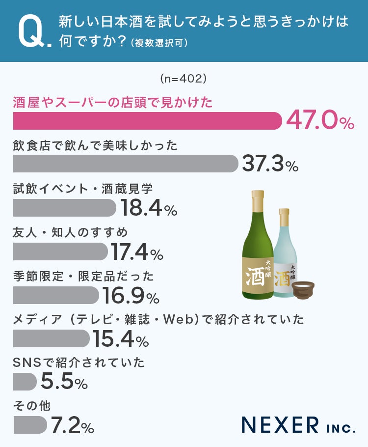 新しい日本酒を試すきっかけとして最も多かったのは「酒屋やスーパーの店頭で見かけた」で47.0%でした。次いで「飲食店で飲んで美味しかった」が37.3%、「試飲イベント・酒蔵見学」が18.4%と続きました。