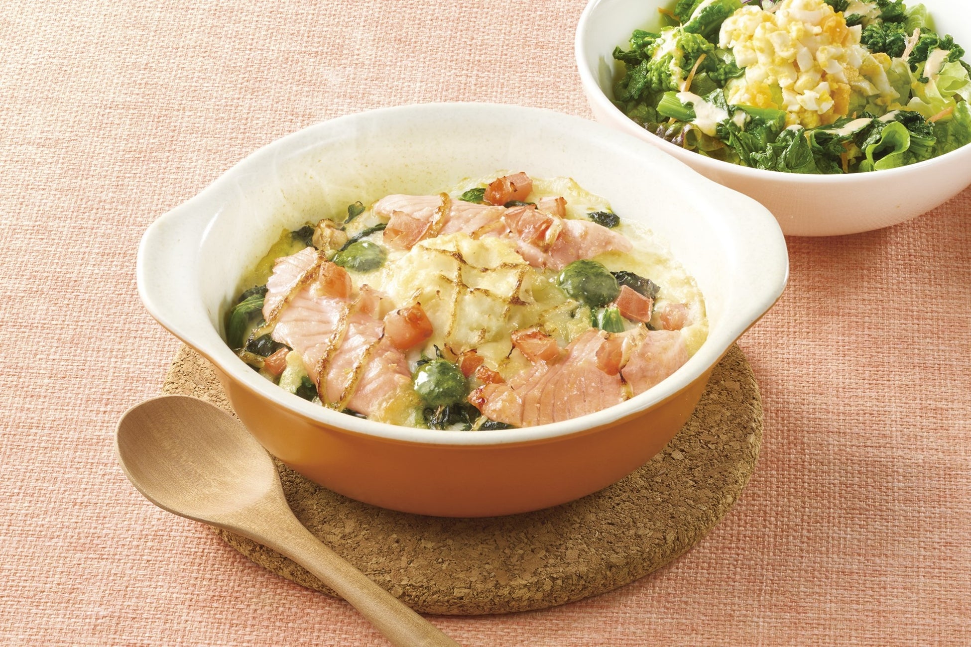 とろサーモン・ポテト・大葉のドリア+菜の花のミモザサラダ