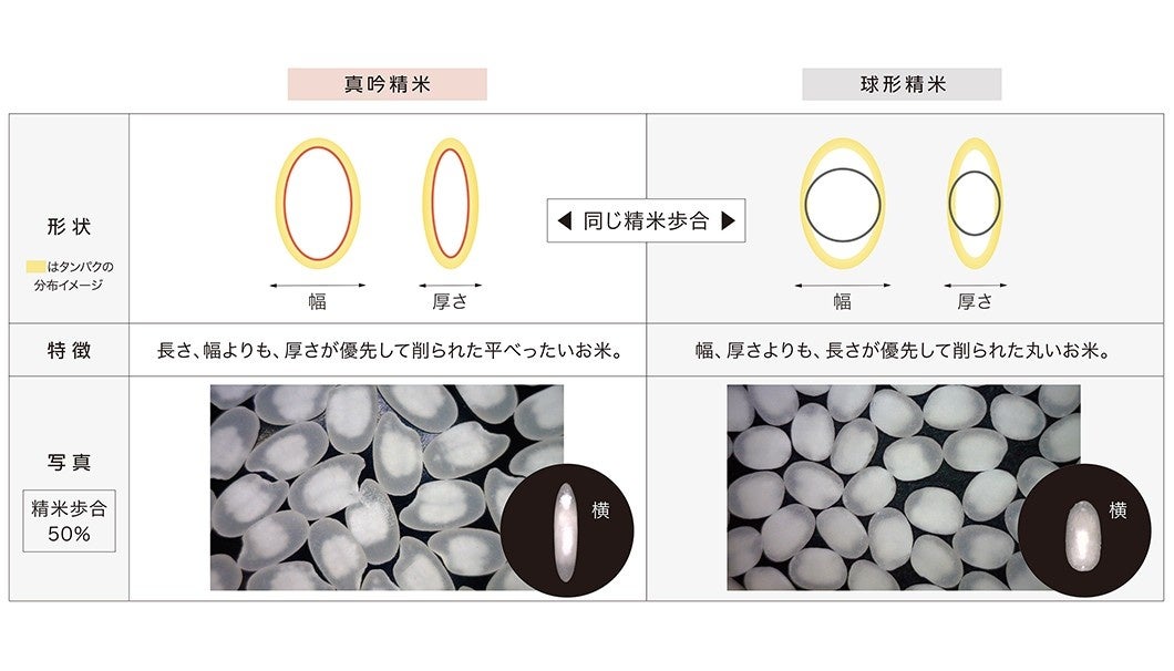 原料米の処理において、原料の一部に米の厚さ方向を均等に削る「扁平精米(へんぺいせいまい)」技術を新たに導入しました。これにより、酒の雑味となるタンパク質を効率的に除去し、米を削りすぎることなくクリアな酒質を実現しました。