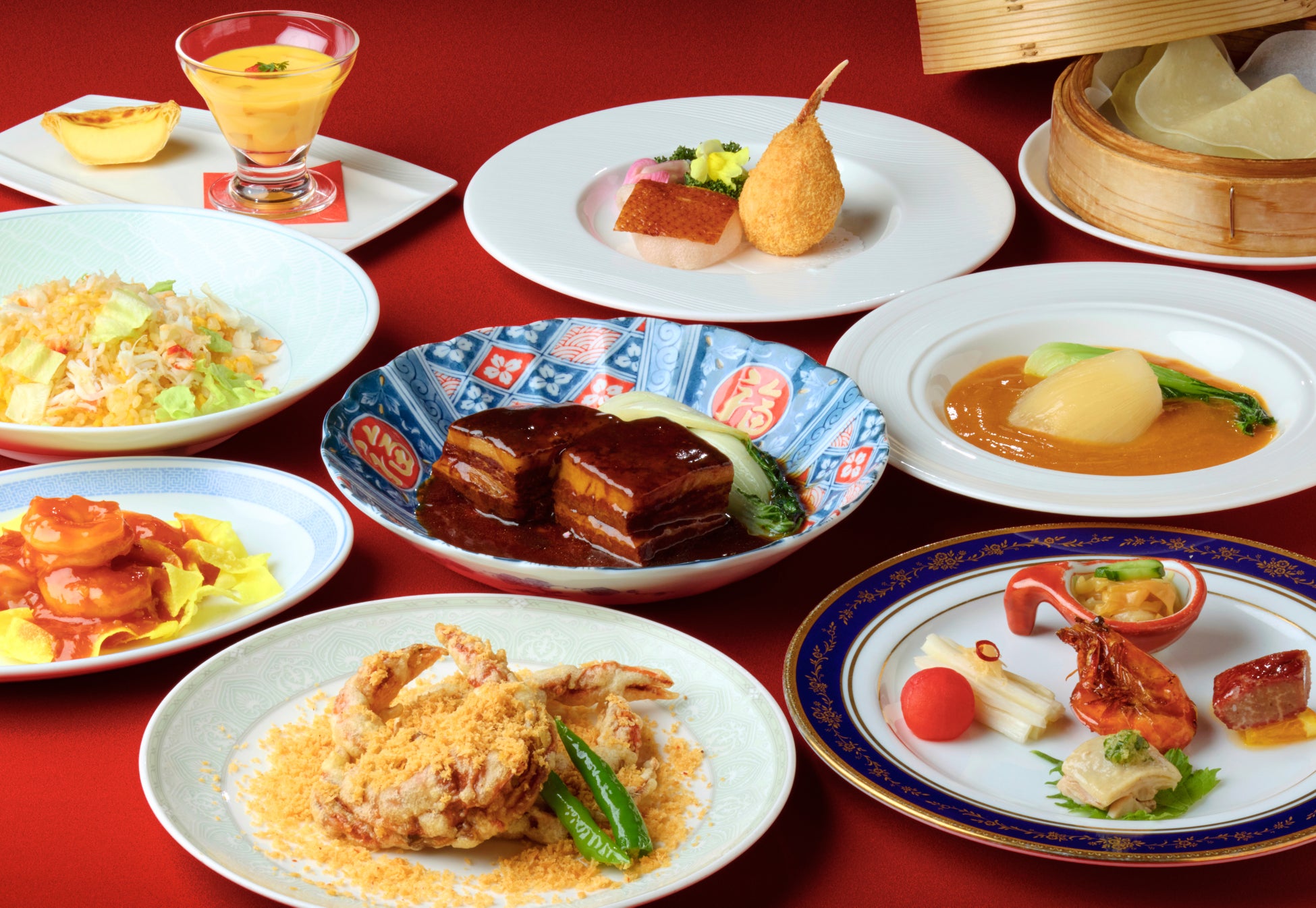 ※20周年記念ディナーコースの写真<龍鳳 源流コース>の「海鼠と豚ひき肉のピリ辛煮」「海老の甘辛ソース」「蟹と白身魚のふわふわ」「海鮮入りつけ麺」、<龍鳳 昇流コース>の「海老のチリソース」「豚バラの醤油煮込み」「ソフトシェルクラブのスパイシー炒め」「蟹肉とレタスの炒飯」は、2名分のイメージです